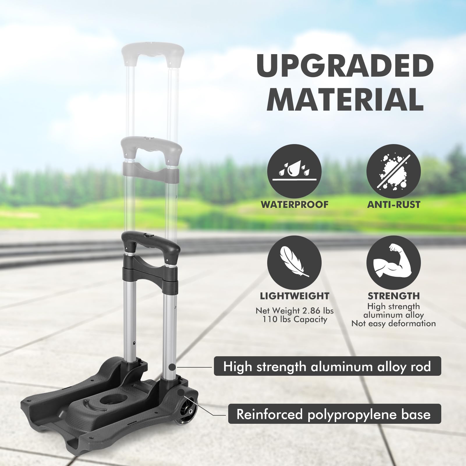 • ADJUSTABLE HEIGHT AND DURABLE HANDLE: The light cart dolly has 3 different height adjustments from 15.9' to 37.4'. Press the handle button to adjust the height. The rod is made of high-quality aluminum alloy, not easy to be deformed. The base of foldable push cart is made of thickened and reinforced PP. Make the utility dolly cart lightweight but also durable.