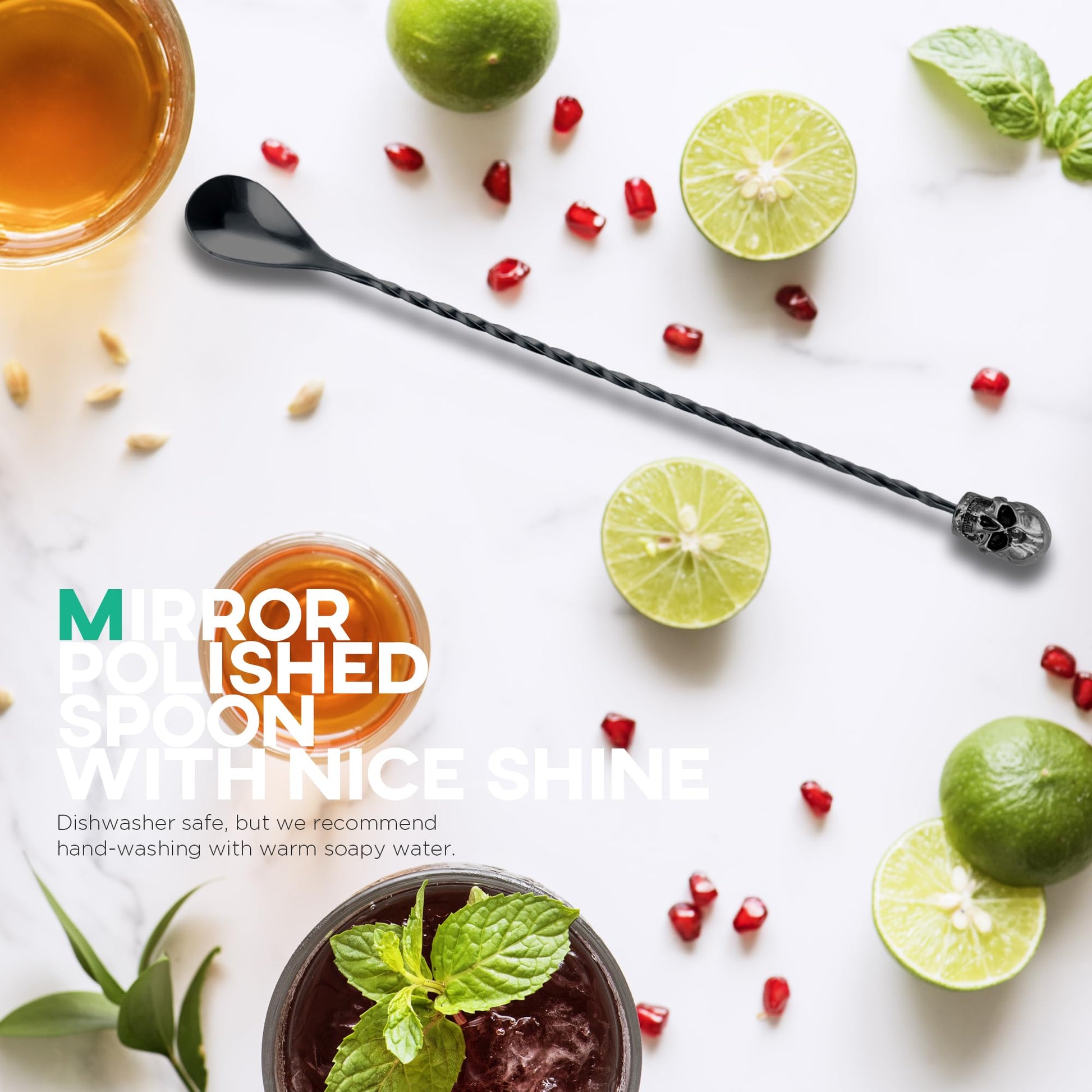 • OPERATION: The zinc alloy skull decoration on the top of the spoon adds a unique and charming style to your bar tools, and a spiral shaped rod in the middle for better control and grip, designed to spin effortlessly. Perfect for stirring drinks, mixing cocktails, juices, smoothies or milkshakes.