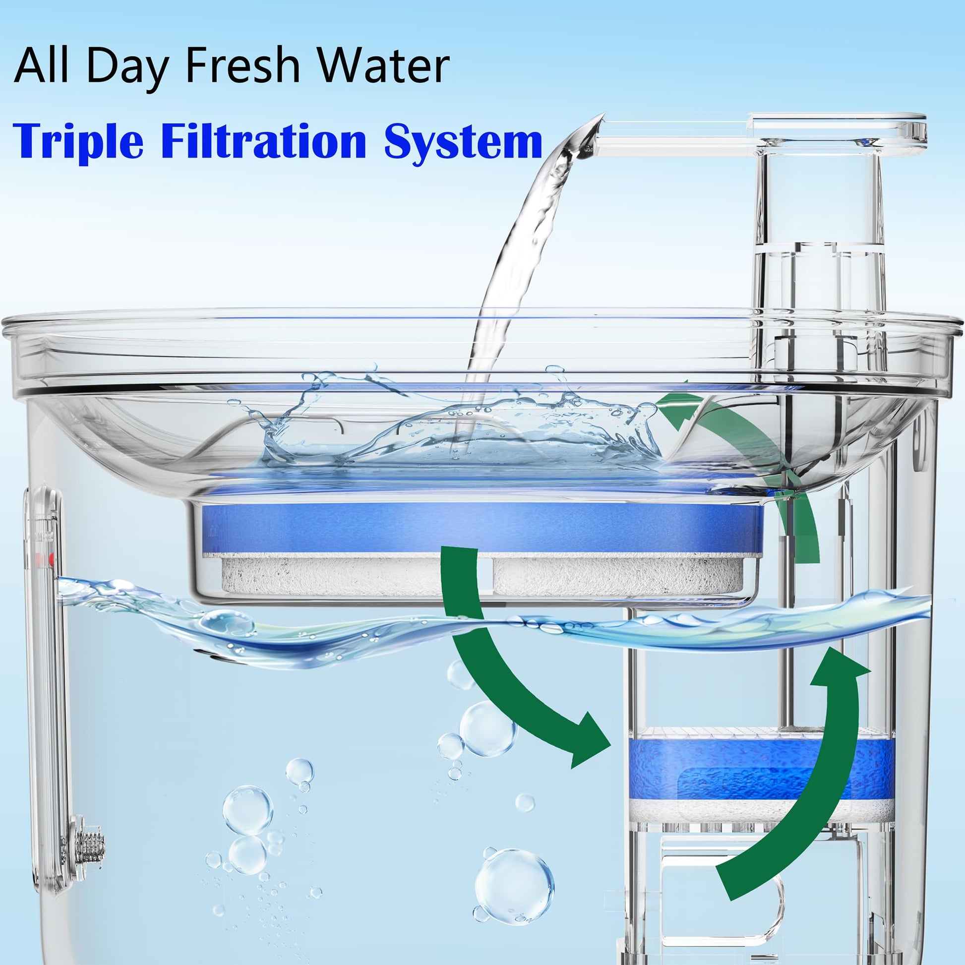 • Triple Filtration Cat Fountains: Water will be filtered by a blue pre-filter sponge firstly, then by an activated carbon filter and a sponge filter with cotton net again. the automatic cat and dog water fountain can provide your pet with pure drinking water, preventing limescale and dirt building up.