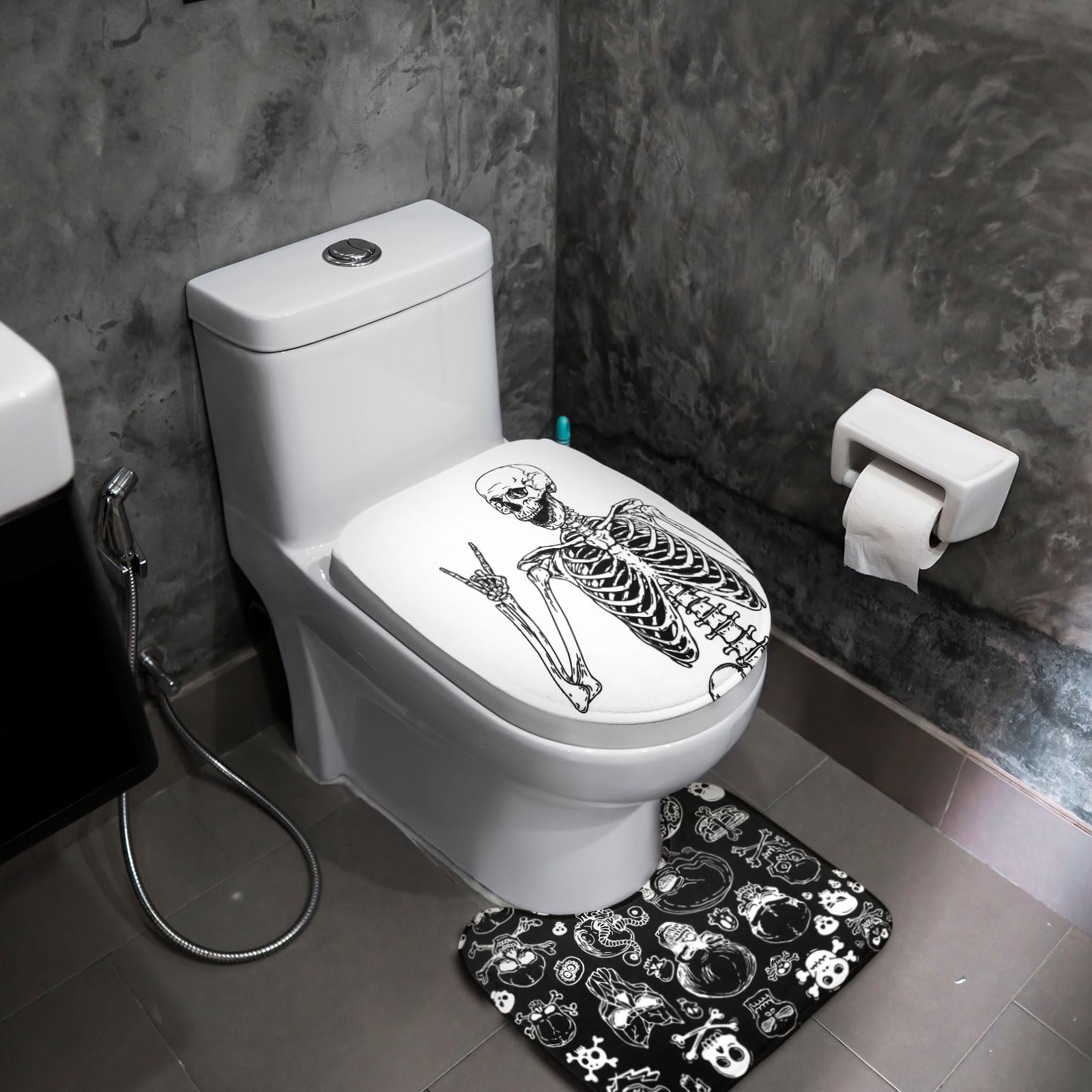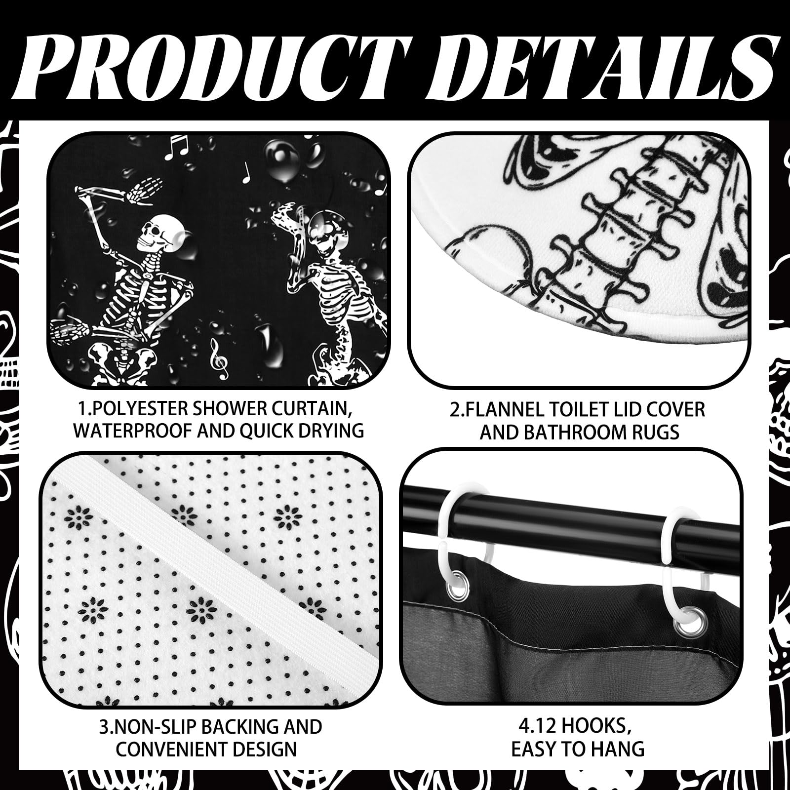 Skeleton Shower Curtain Set: the shower curtain set with rugs and accessories set includes 4 skeleton towels for bathroom, 12 practical hooks, 1 shower curtain, 1 U shaped rug, 1 toilet lid cover, and 1 bath mat; This comprehensive package ensures you have everything you need for a complete and coordinated bathroom and kitchen look