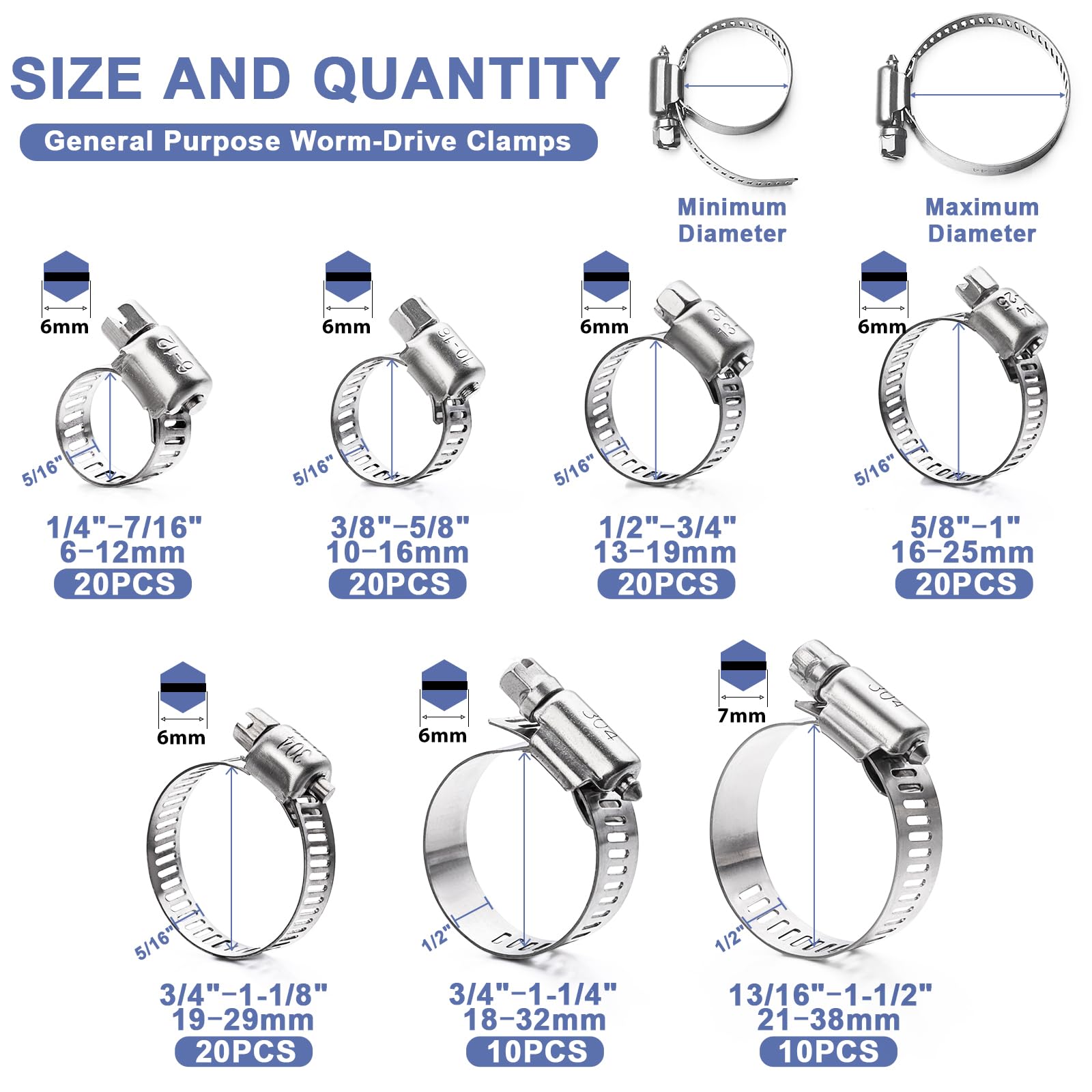 • Wide Adjustable Size Range: Total 120 pcs hose clamps assortment are flexible and ductile, range from 1/4 inch to 1-1/2 inch (6mm to 38mm). 20pcs 1/4'' to 7/16'', 20pcs 3/8'' to 5/8'', 20pcs 1/2'' to 3/4', 20pcs 5/8'' to 1'', 20pcs 3/4'' to 1-1/8'', 10pcs 3/4'' to 1-1/4'' and 10pcs 13/16'' to 1-1/2''