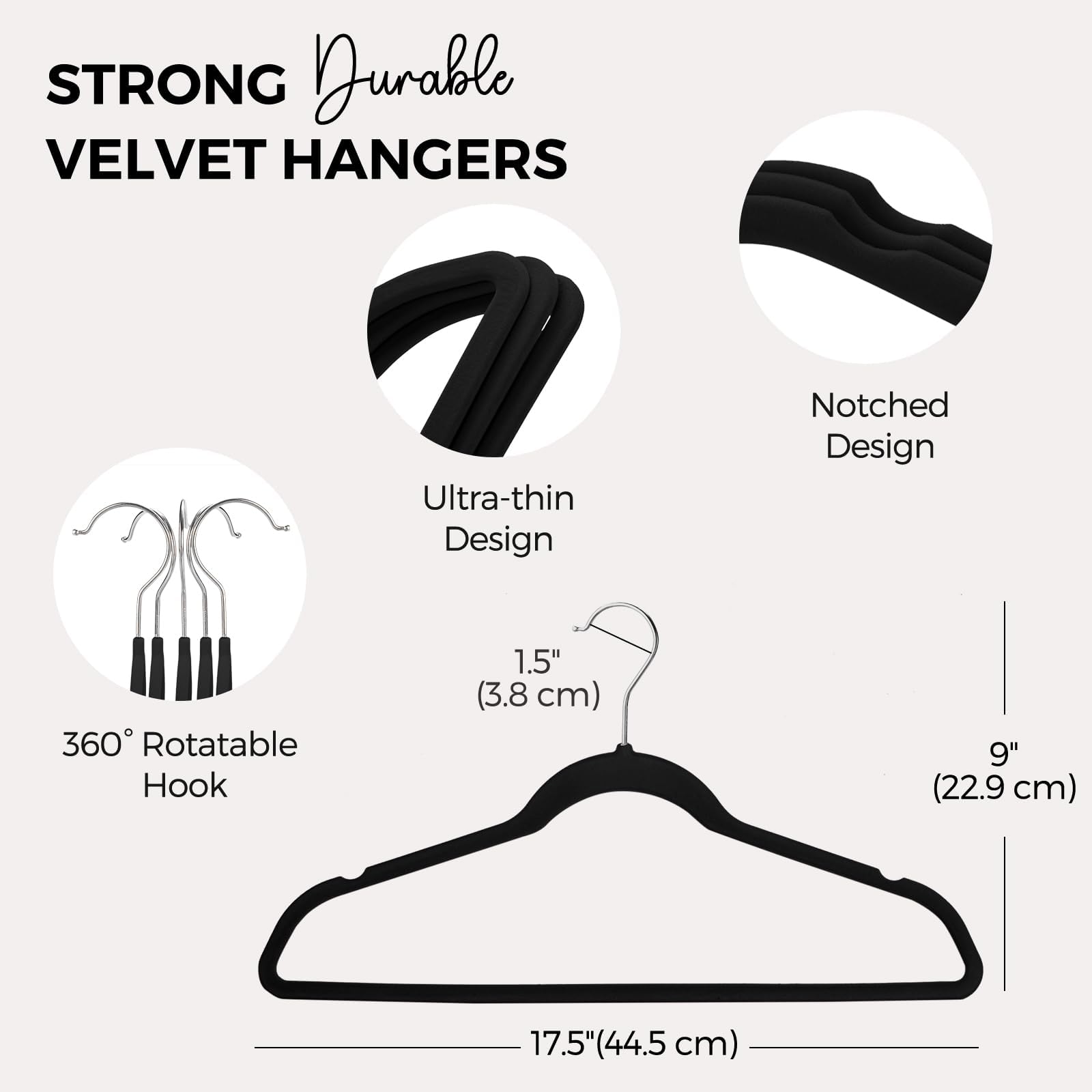 • Space Saving Design - The ultra-thin design with an optimal size of 17.5'L x 1/4'W x 9'H each hanger maximizes the storage space and makes full use of your wardrobe and room to make it clutter-free. Increases closet space by up to 75 percent. A galvanized metal hook with a 360-degree swivel meets your different hanging angle needs, good for easy clothing sorting, a perfect combination