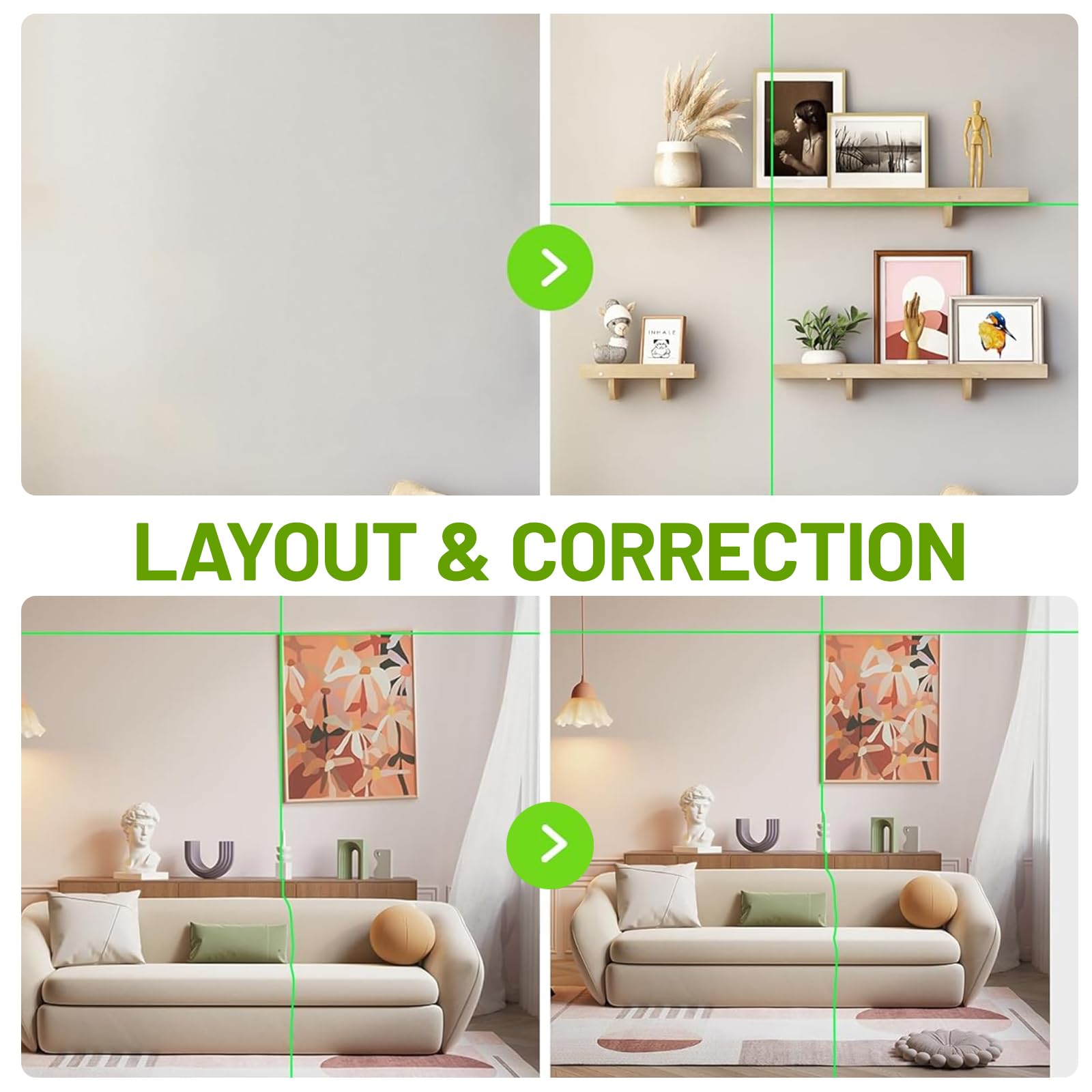 • 【Self-Leveling & Manual Laser Level Modes 】 This self-leveling laser level automatically adjusts within ±4° when unlocked, flashing if out of range (Please note: Make sure the surface on which the level is placed is level when using it, otherwise the laser line will flash continuously). Lock the pendulum to enter manual mode and project angled lines—perfect for stairs, wall patterns, or custom layouts. Enjoy flexibility and precision with this versatile laser level.