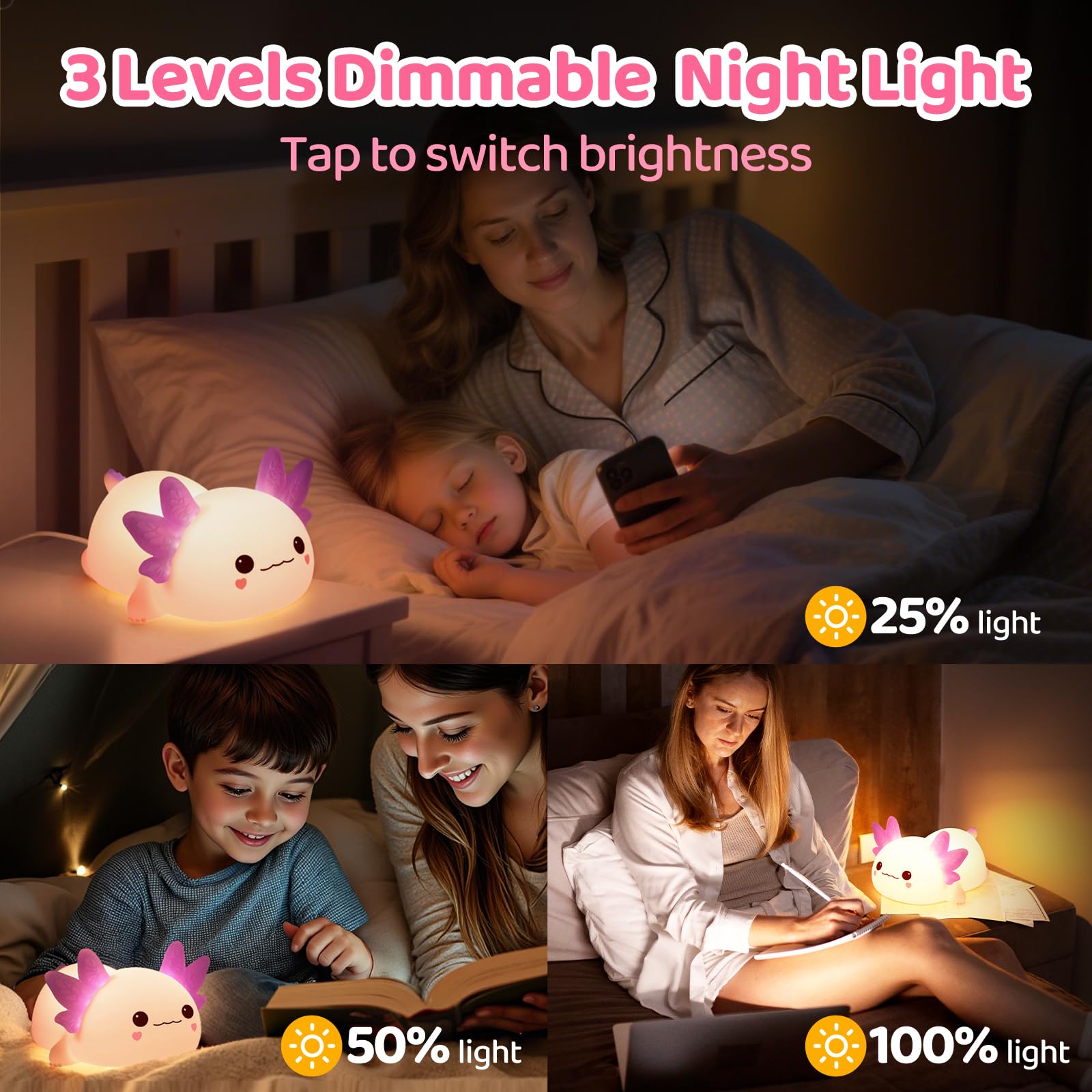 • 3 Level Brightness Axolotl Lamp: Customize the dimmable silicone kids night light with 3 different brightness levels to suit any situation. he softest light (25%) creates a calming environment for sleep, while the medium setting (50%) is ideal for reading bedtime stories. The brightest setting (100%) offers clear illumination for nighttime activities such as diaper changes or breastfeeding, ensuring a gentle yet practical lighting experience for parents and kids alike. Say goodbye to constant trips out of bed. With a simple tap on this axolotl touch night light, you can easily adjust the brightness among three levels. It blends function and style, ensuring a safe, cozy night for your child.