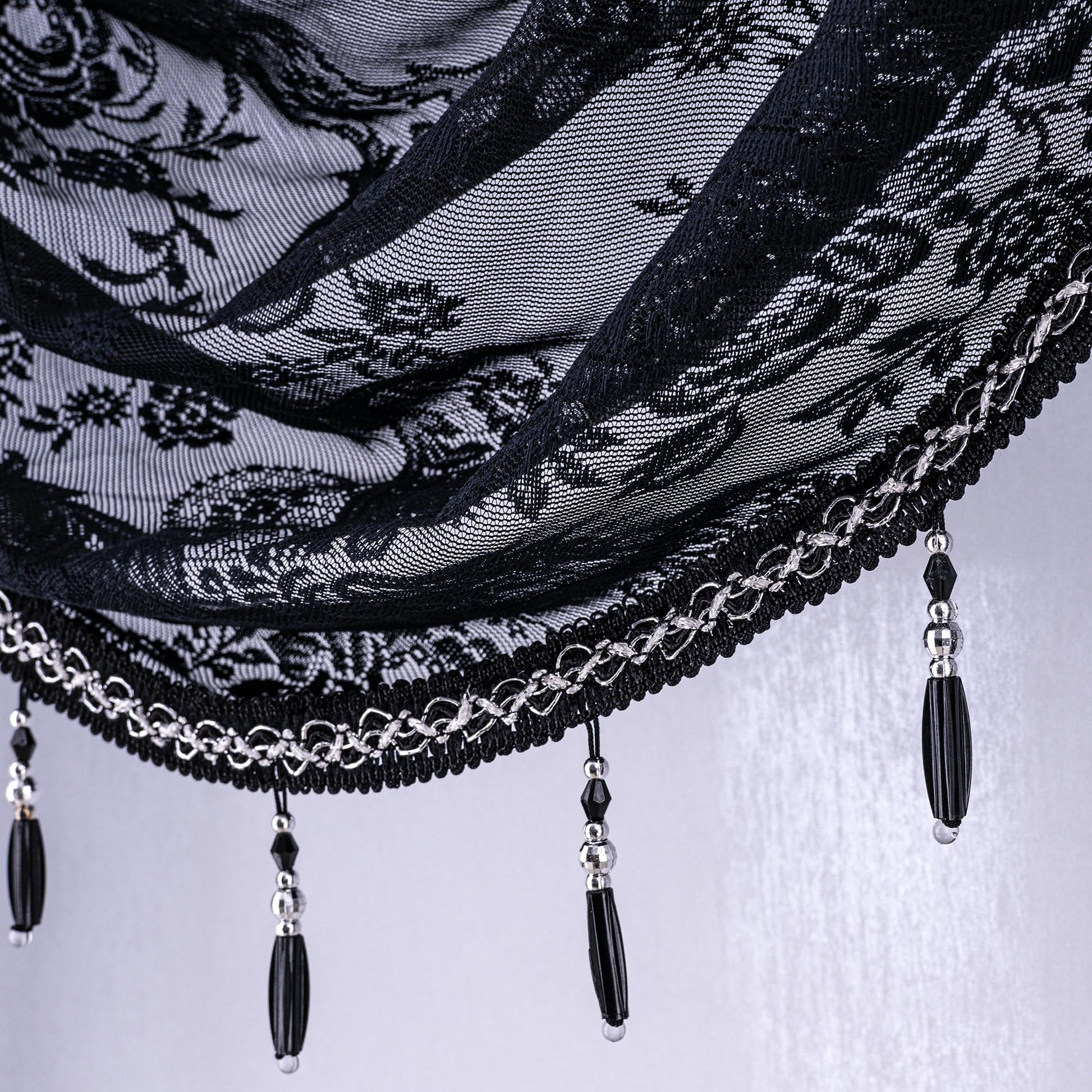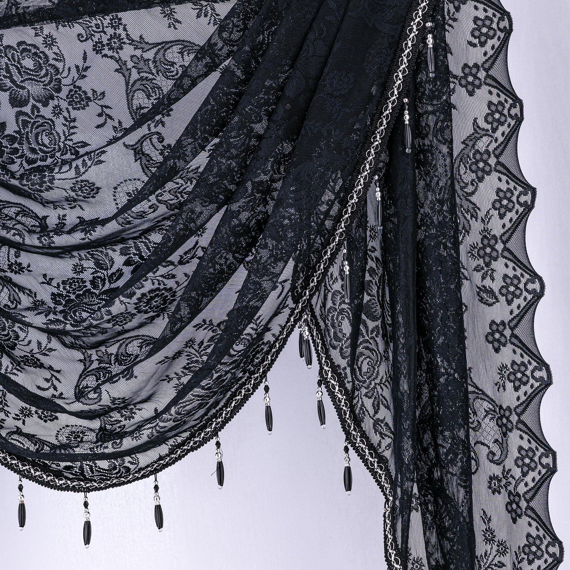 Huierxun Halloween Black Lace Waterfall Window Valance with Bead Tassels Floral Embroidered Valance Curtains Semi Sheer Rod Pocket Valance/Swags for Bedroom/Living Room/Kitchen/Basement(Black,39"x41")