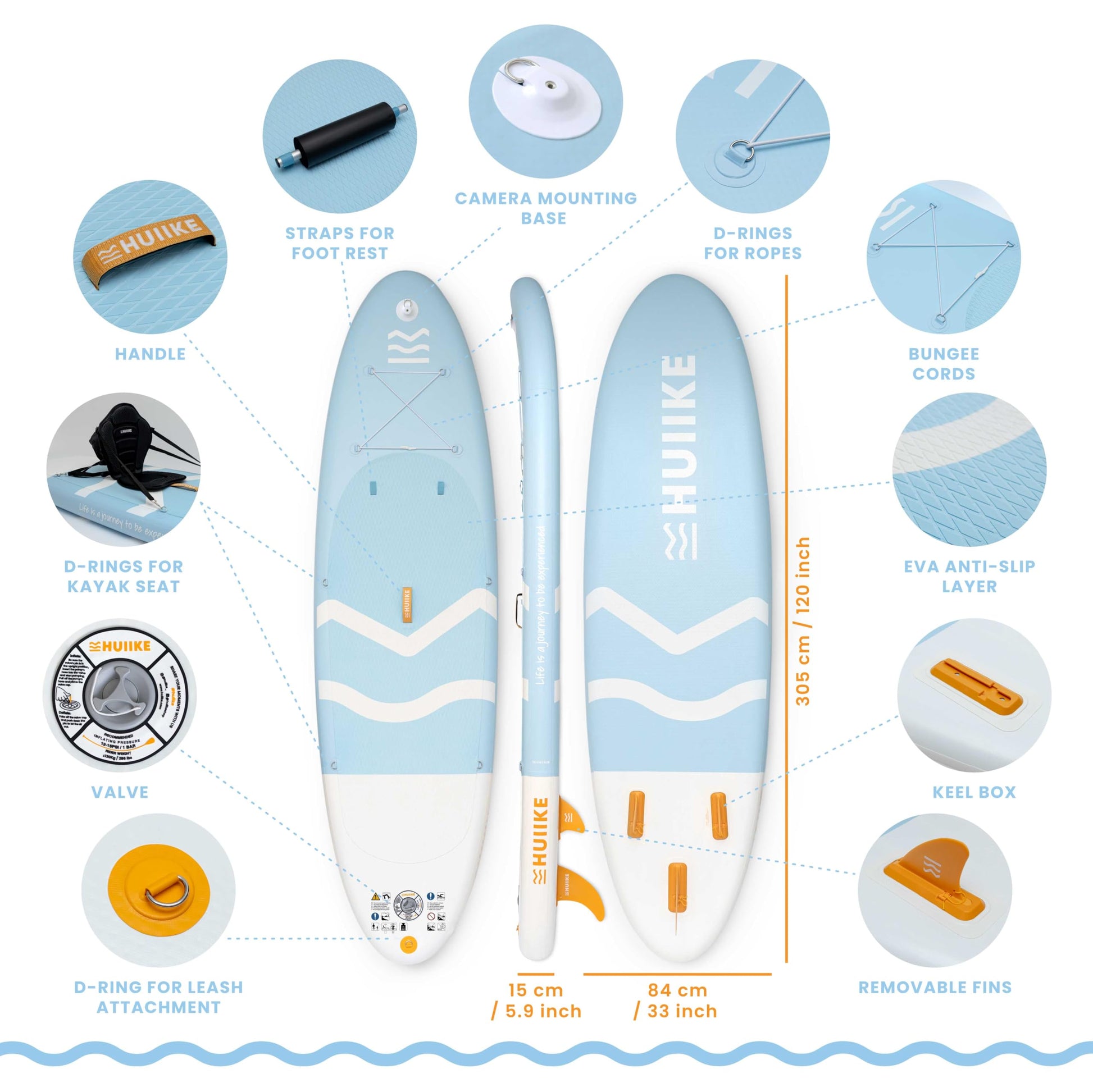 • All the accessories you need - The “Enjoyer - Full Pack” collection includes: blue stand up paddle board, backpack, leash, pump, dual-use aluminum paddle, 3 fins, kayak seat, footrest, carry strap, repair kit, 5L dry bag, phone case and holder