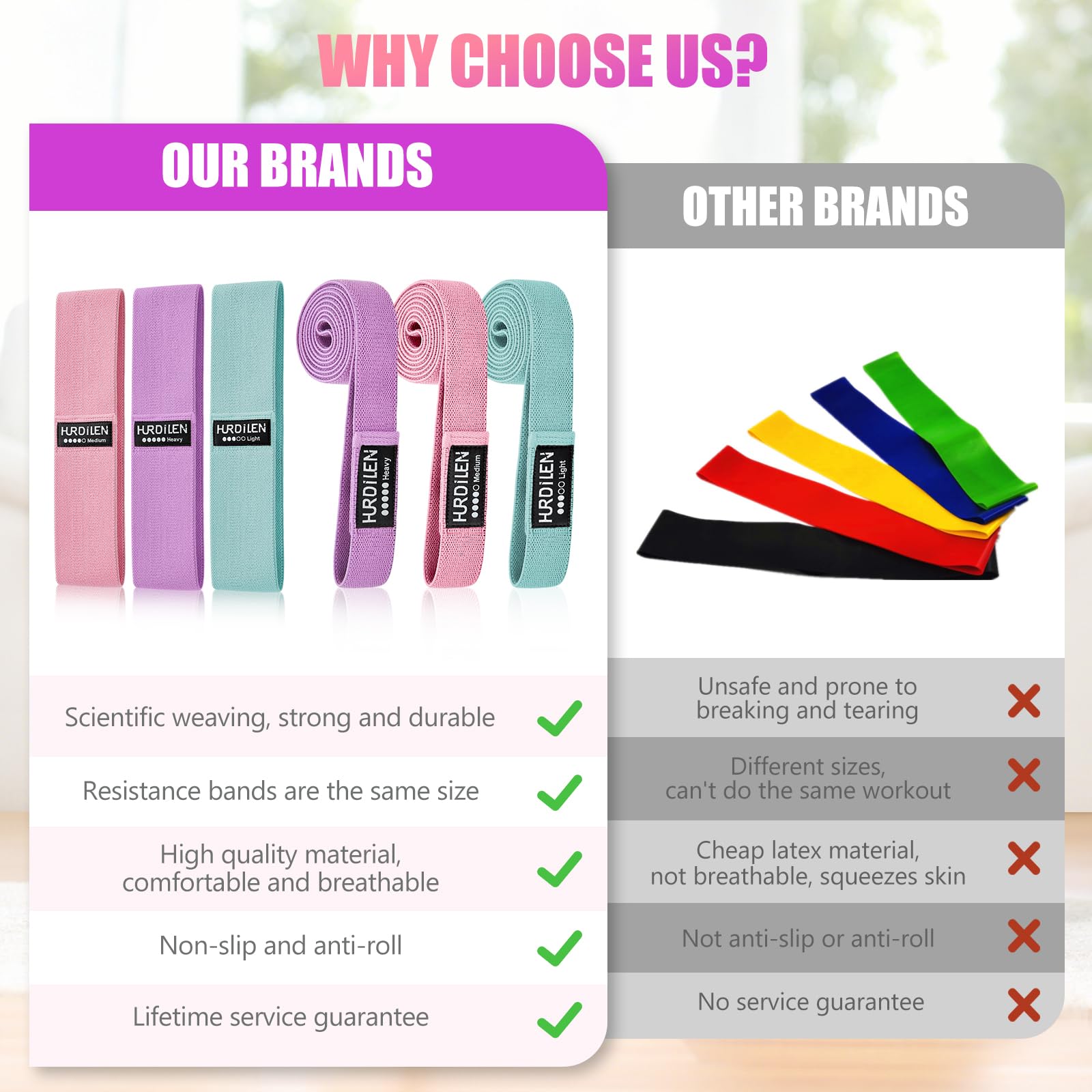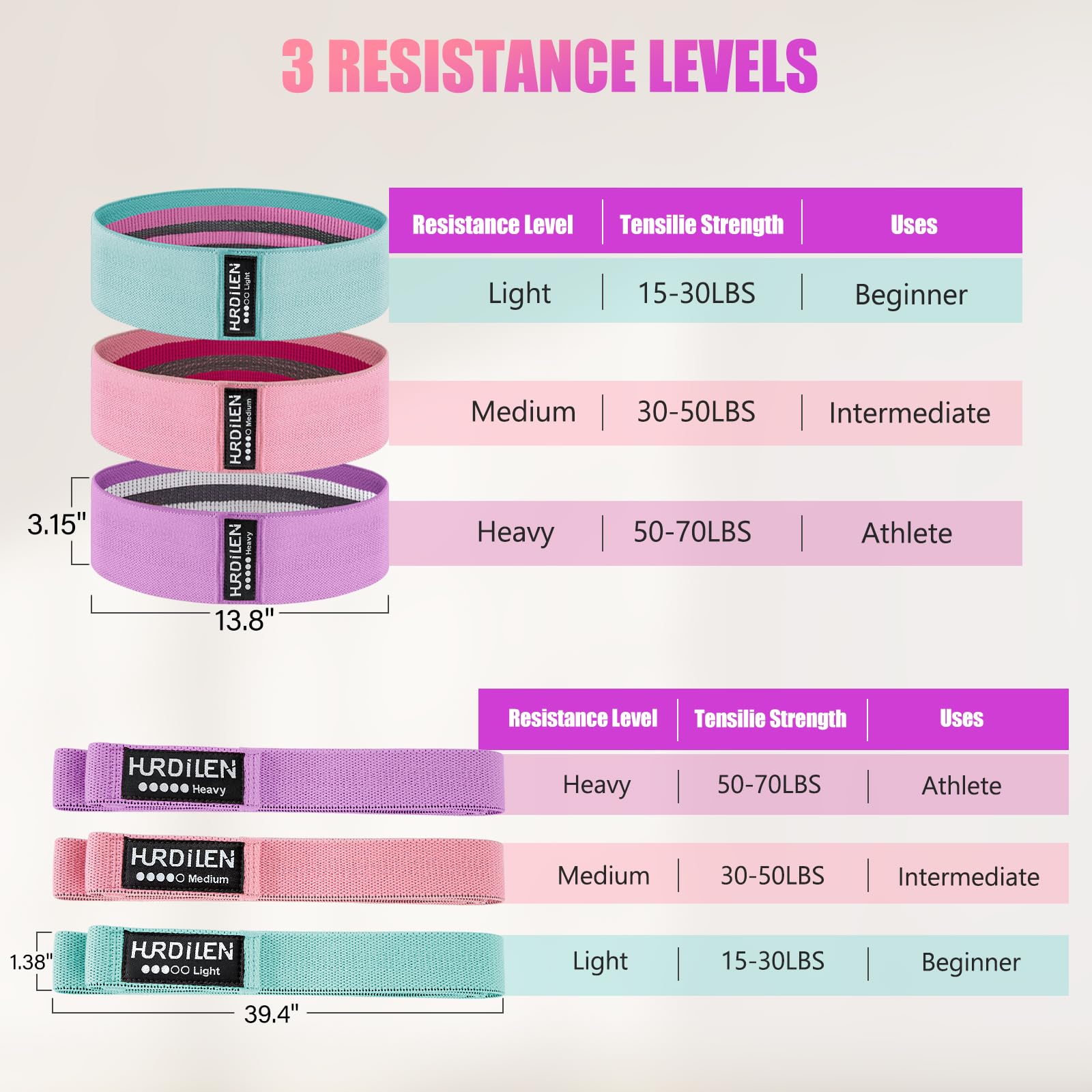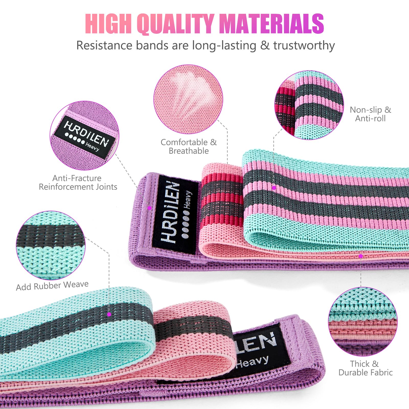 • Superior to TPE Rubber Bands - Hurdilen resistance bands are made of soft, skin-friendly elastic cotton fabric, which is more effective at preventing slipping during workouts on the buttocks, thighs and all over the body, and the soft, woven surface won't chafe and hurt your skin. The exercise bands are woven with natural latex on the inside and have reinforced joints, which increases the elasticity and durability of the resistance bands and prevents them from breaking after frequent stretching.