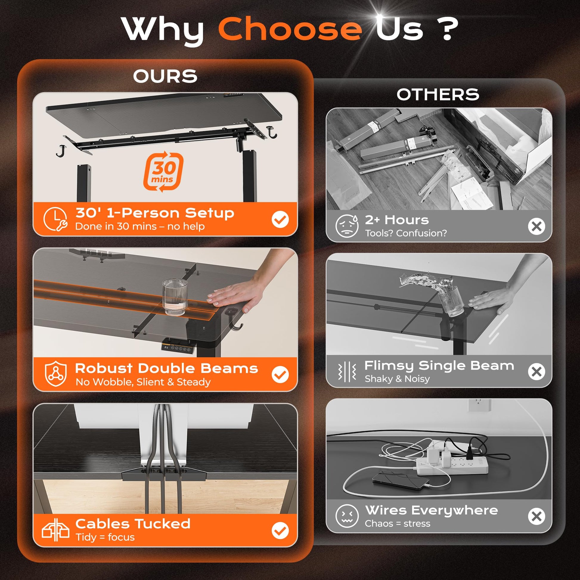 • 【Deep-ended Desktop, Wide Workspace】With a 55 x 27.6 inch wide desktop made from durable and green materials, this electric standing desk adjustable height prioritizes your health and working hours. 2 hooks on both sides of the standing computer desk offer added convenience, keeping your headphone or computer bags organized. Cable managers let you stay away from tangled wires