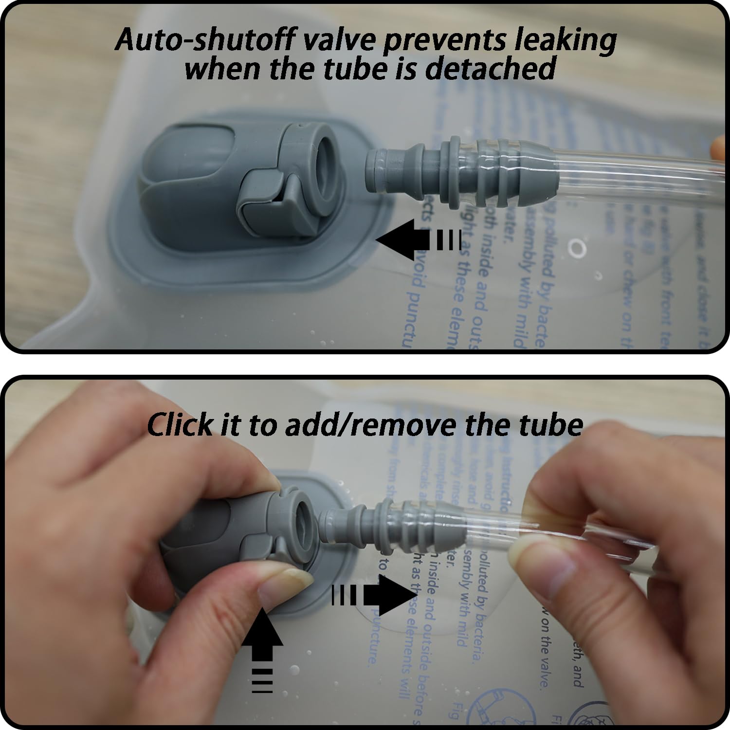 • UPGARDE LEAK PROOF&WHITE TUBES DESIGN: Soft yet durable mouthpiece with easily accessible ON/OFF valve prevents leakage. You can control the water flow by biting, First pull up on the drinking cap, gently bite the mouthpiece with your front teeth to have a sip and start drinking, push back to stop water flow. Quick-release tube is detachable. The hydration bladder will stay filled non-leaking. The bladder bags also has a dust cover to keep dirt out.