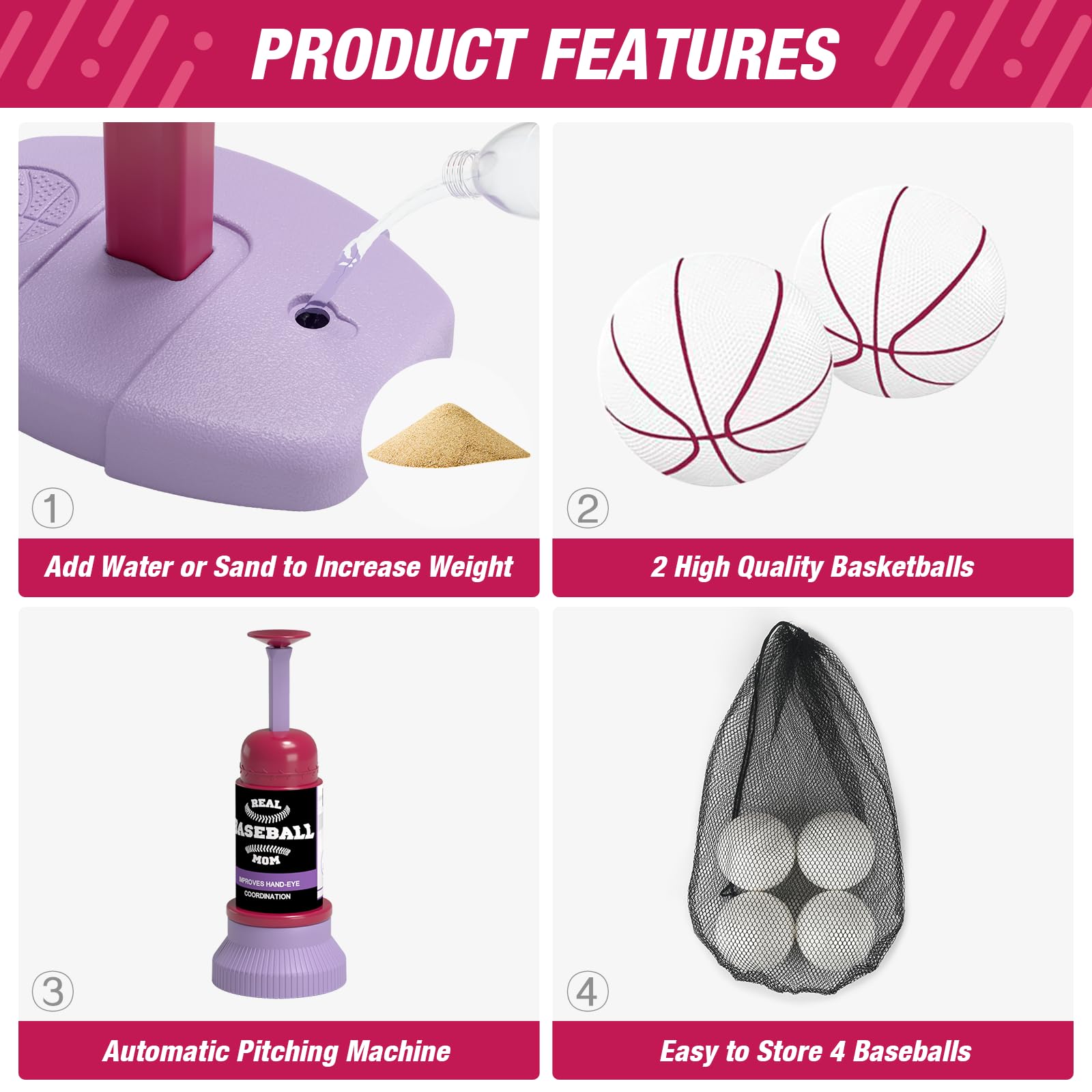 • 3 WAYS TO PLAY - ①Kids basketball hoop: with 2 basketballs for multi-player games. ②Kids baseball tee stand: with stretchable bat and 4 baseballs. ③Automatic pitching machine: hitting an automatically ejected baseball. 2 in 1 kids basketball hoop and tball sets provide you and your family or friends to enjoy a fun sport game and have more fun