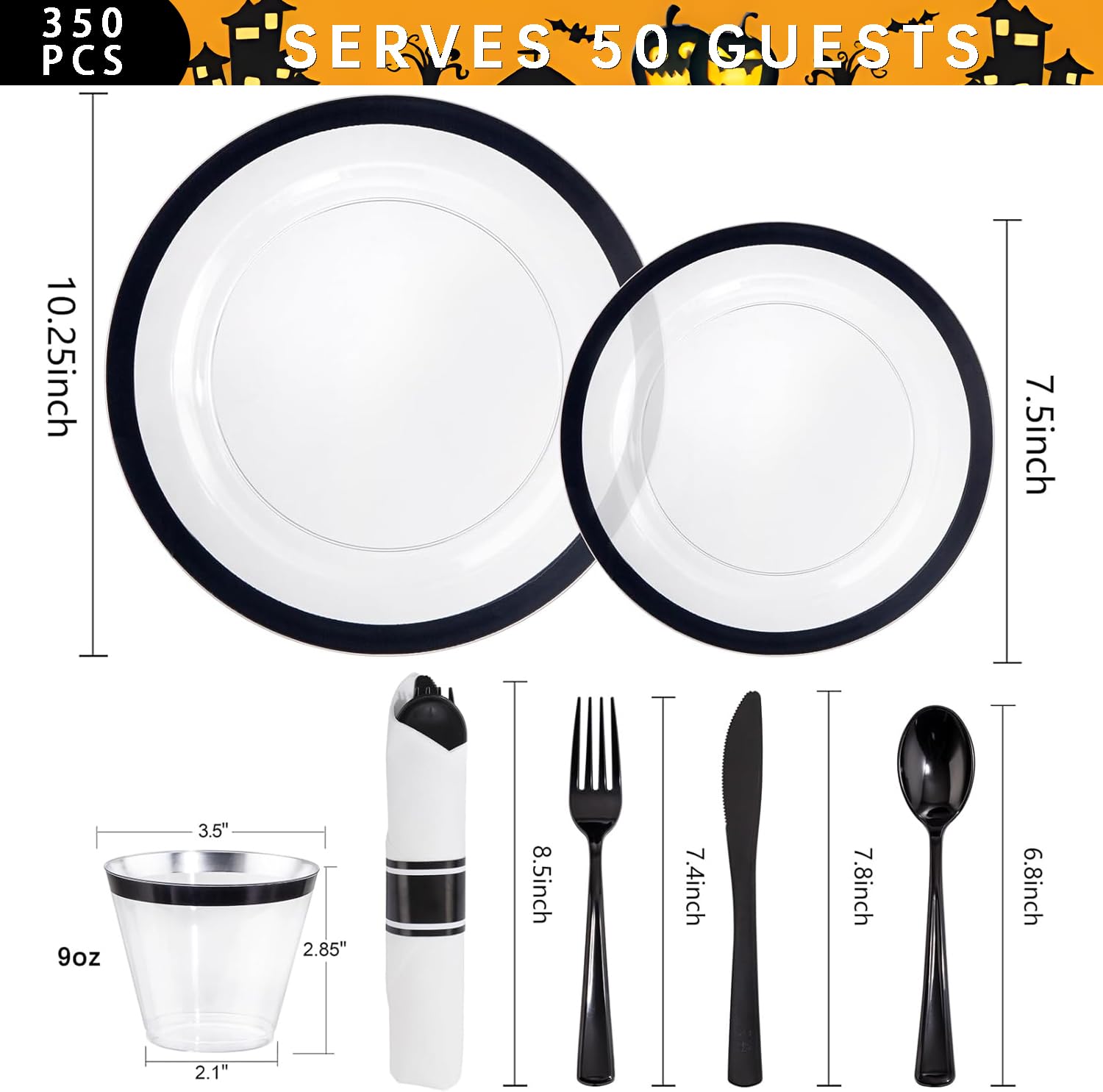 I00000 350 Pcs Clear and Black Plastic Plates,Black Dinnerware Set, Include 50 Dinner and 50 Dessert Plates,50 Plastic Cups,50 Per Rolled Napkins with Cutlery for Party,Wedding,Halloween