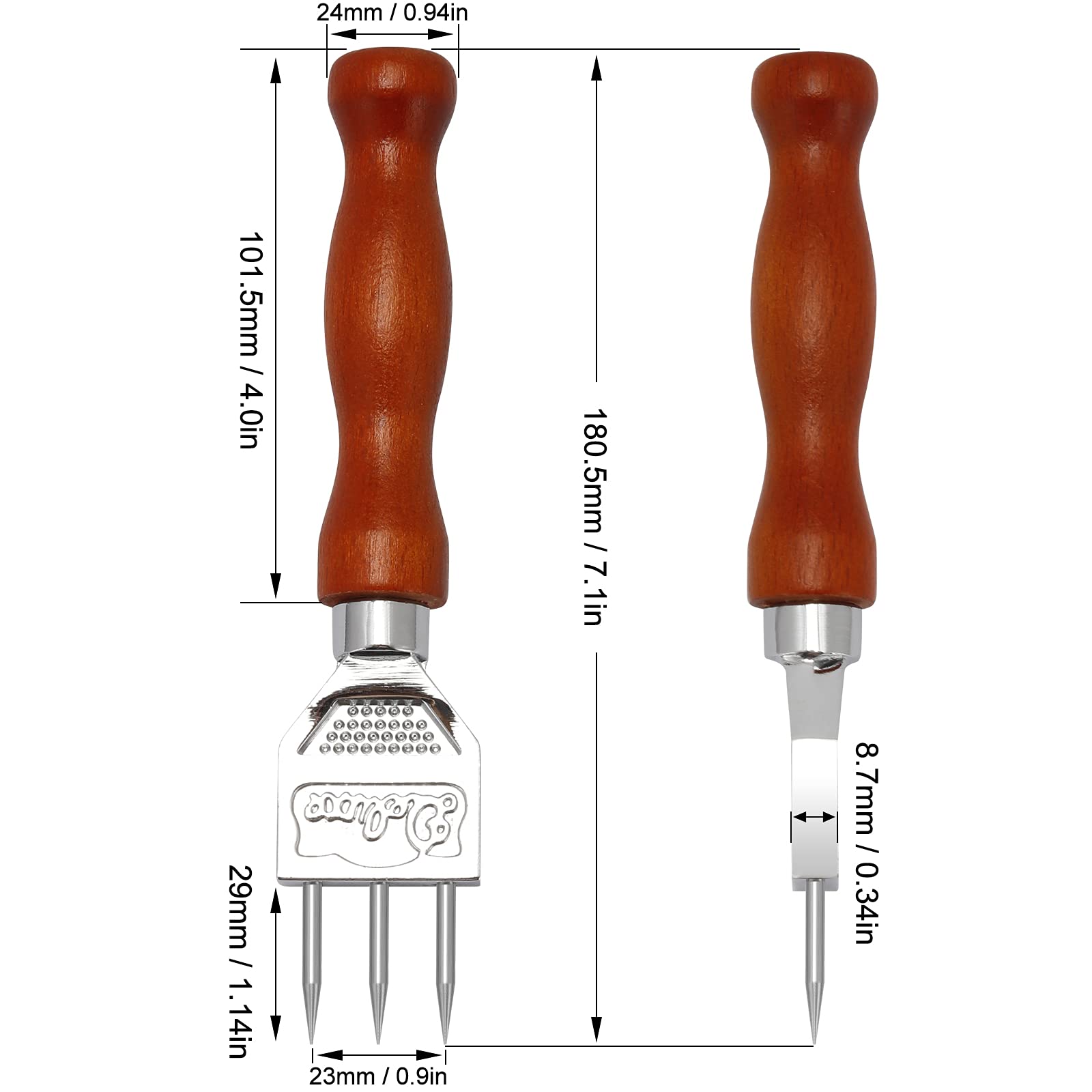 18/10 food grade stainless steel spikes with comfortable wooden handle for easy grip.