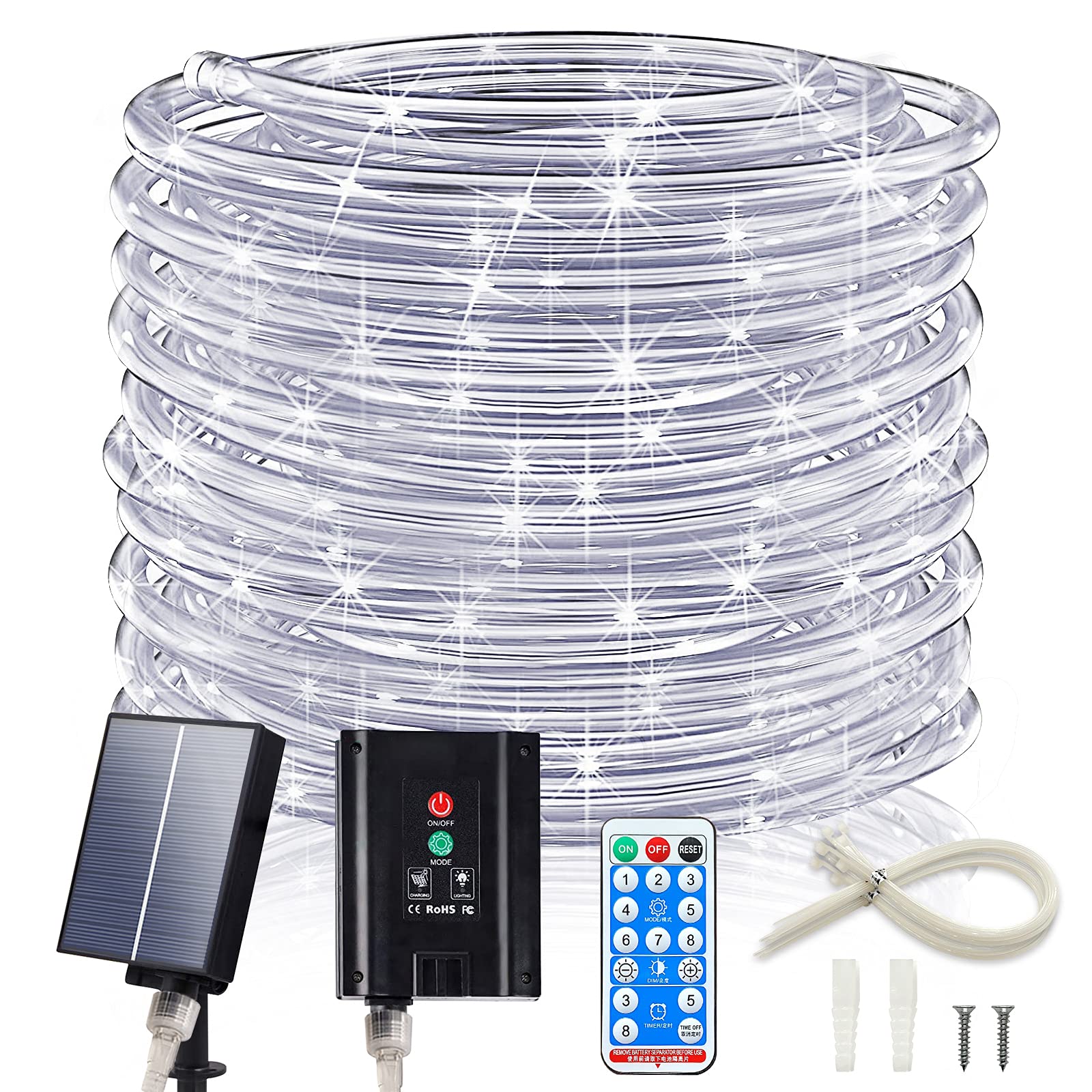 ICRGB Solar Rope Lights, 66FT 200LED 1800mAh Outdoor Waterproof Solar Lights with Remote, IP67 String Light with Timing & 8 Modes for Garden Tree Pathway Yard Pool RV Christmas Decor, White