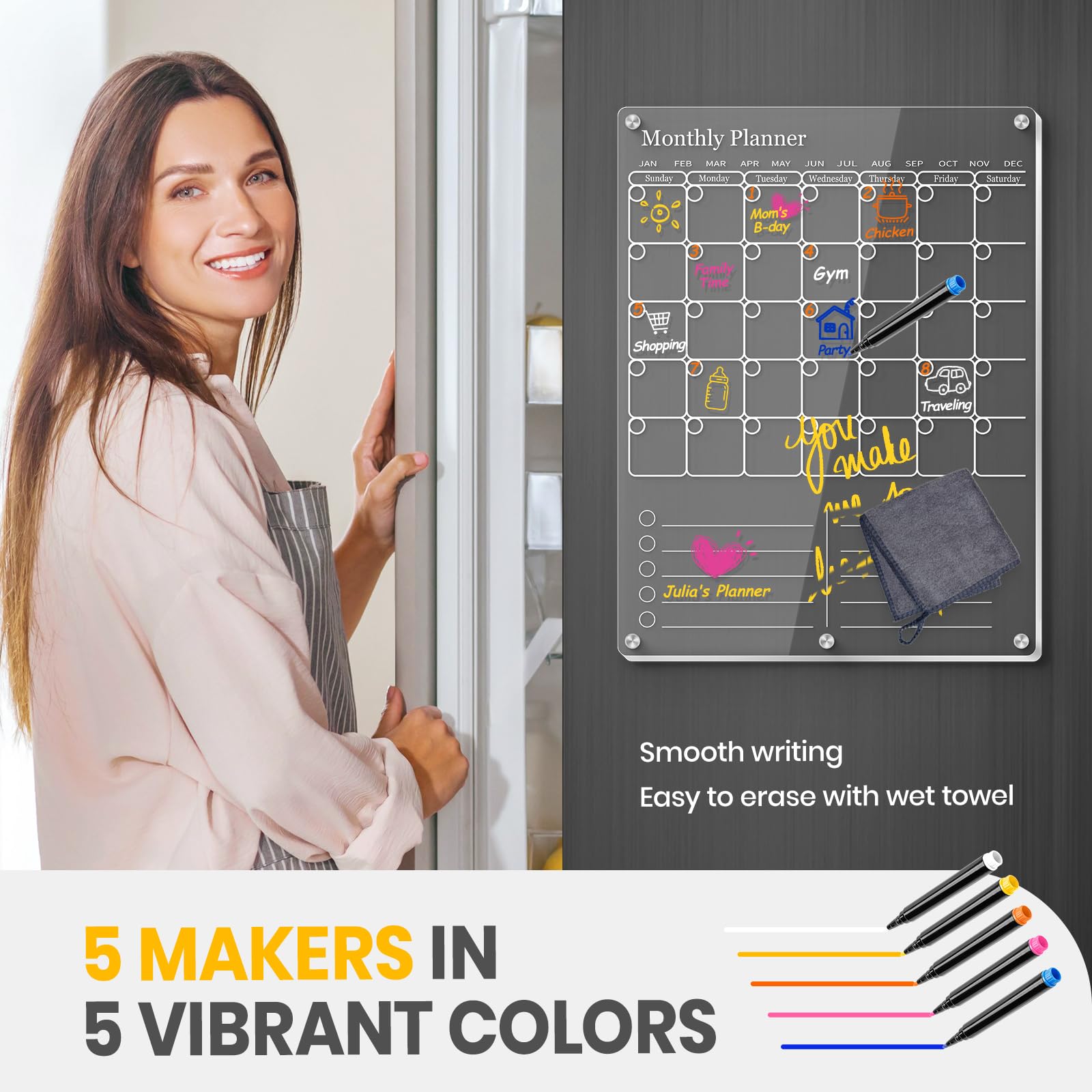 • 5 Color Marker, Legible Handwriting: The magnetic calendar equipped with smooth writing 5 colors marker, you can easily jot down appointments, reminders, and important dates on the fridge acrylic calendar without any smudging