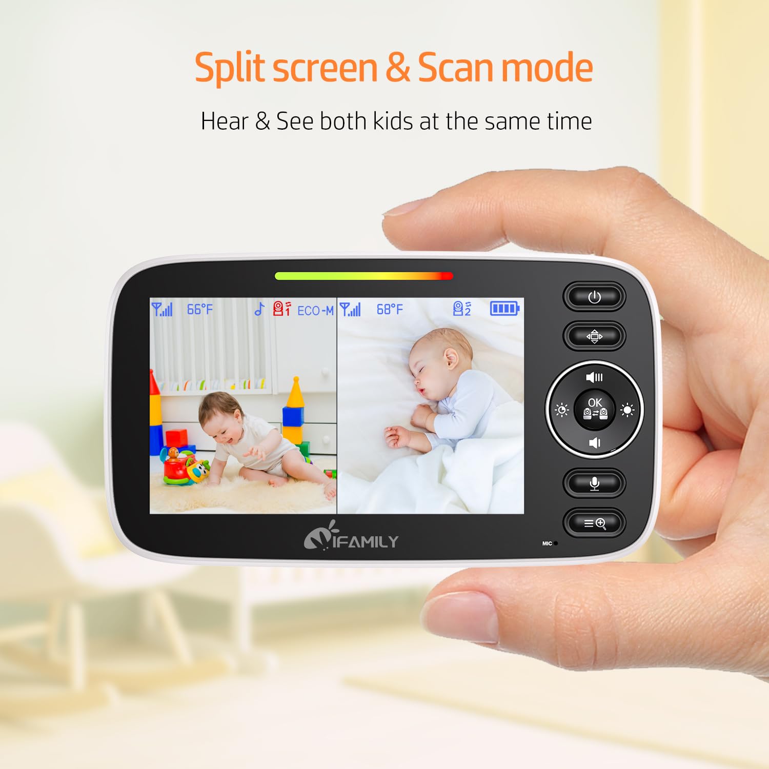 iFamily Split Screen Baby Monitor, Large Display Video Baby Monitor with 2 Cameras and Audio, Long Range, Remote pan tilt, Night Vision, Temperature Sensor, 2 Way Talk, Feeding Clock and lullabies.