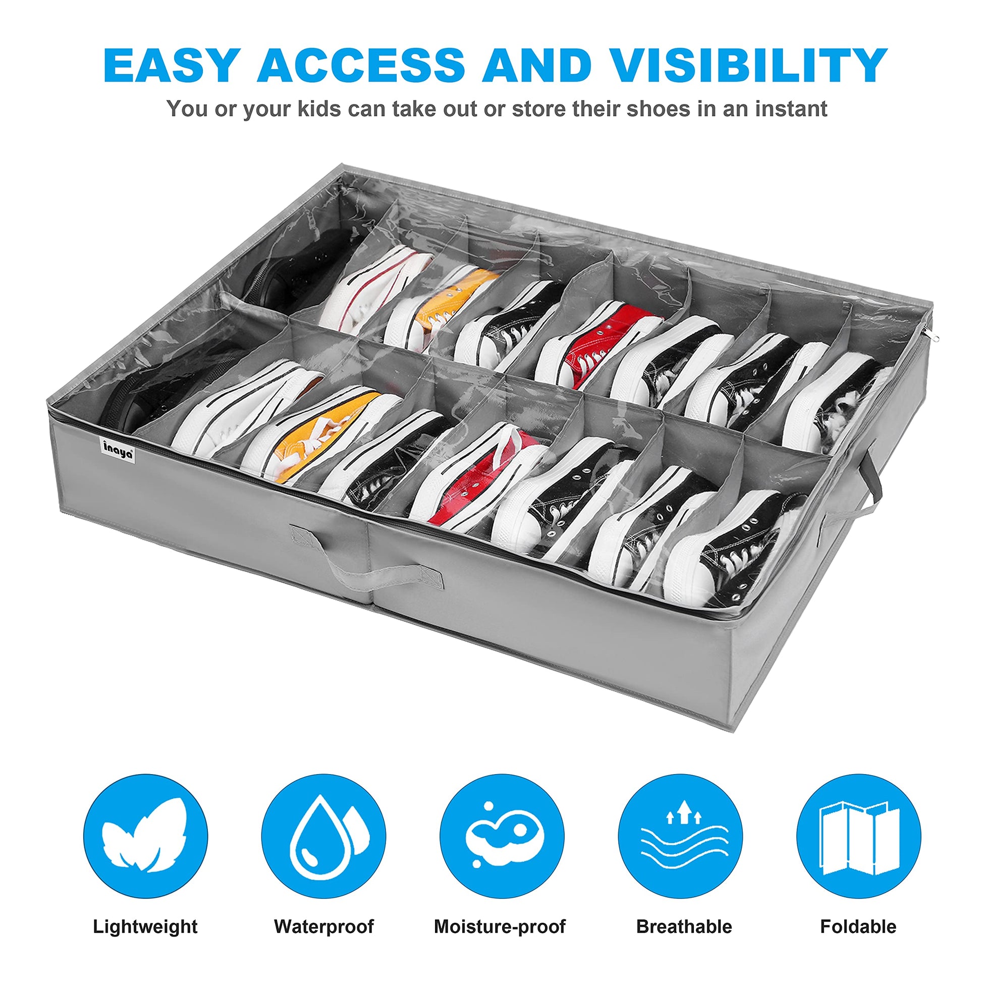 INAYA Under Bed Shoe Storage Organizer Set of 2, Fits 32 Pairs, Underbed Shoe Box Storage Containers Adjustable Dividers w/Bottom Support, Clear Foldable Shoes Storage w/Reinforced Handles