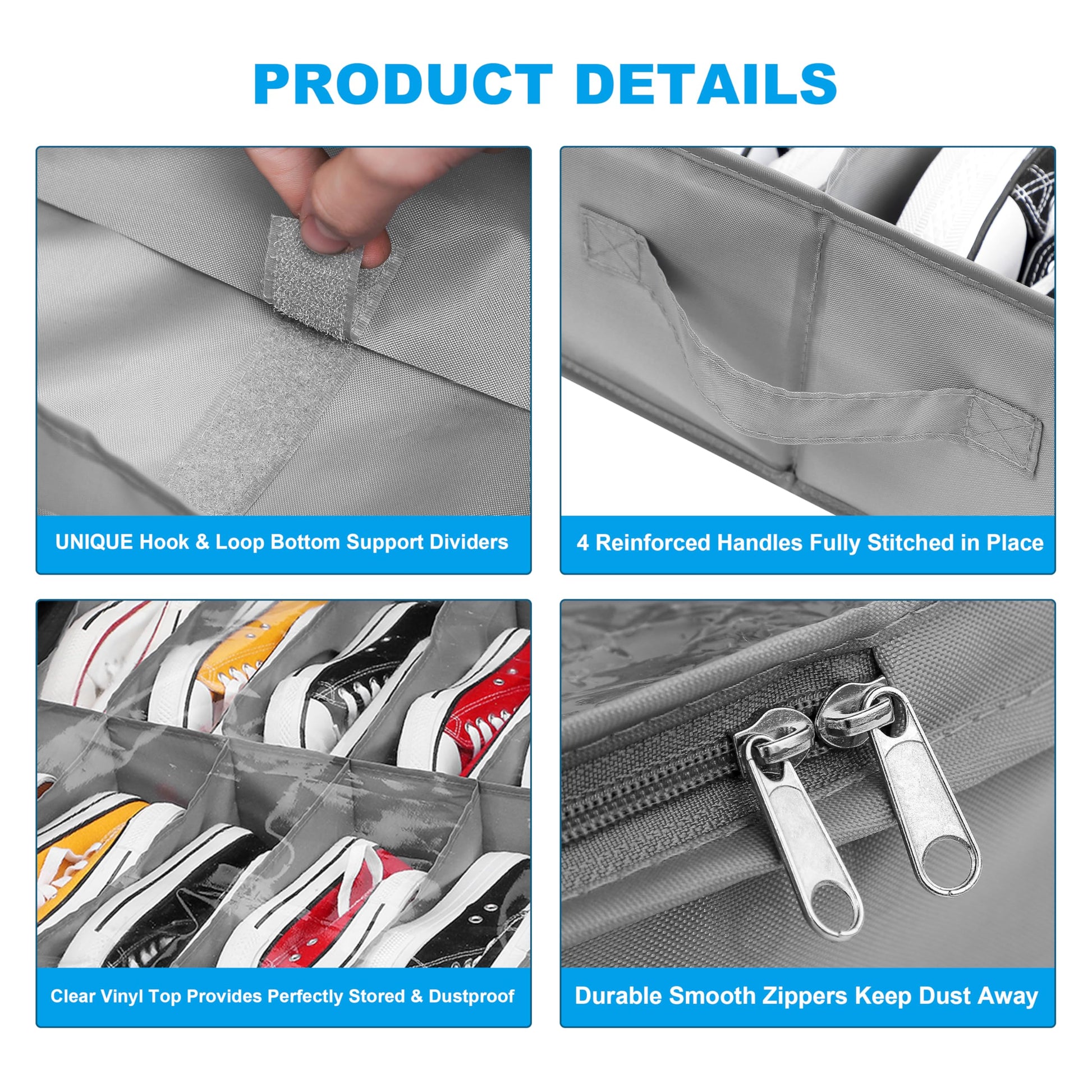 • ✔️UNIQUE DIVIDERS THAT WON'T FLOP AROUND - Other shoe storage containers have cheap, flimsy dividers that don’t keep your shoes securely in place. That won’t be an issue with this organizer. Our dividers have hook & loop fasteners, adjust the dividing line for tightness to make it fit your shoes more snugly and better protect your precious shoes.