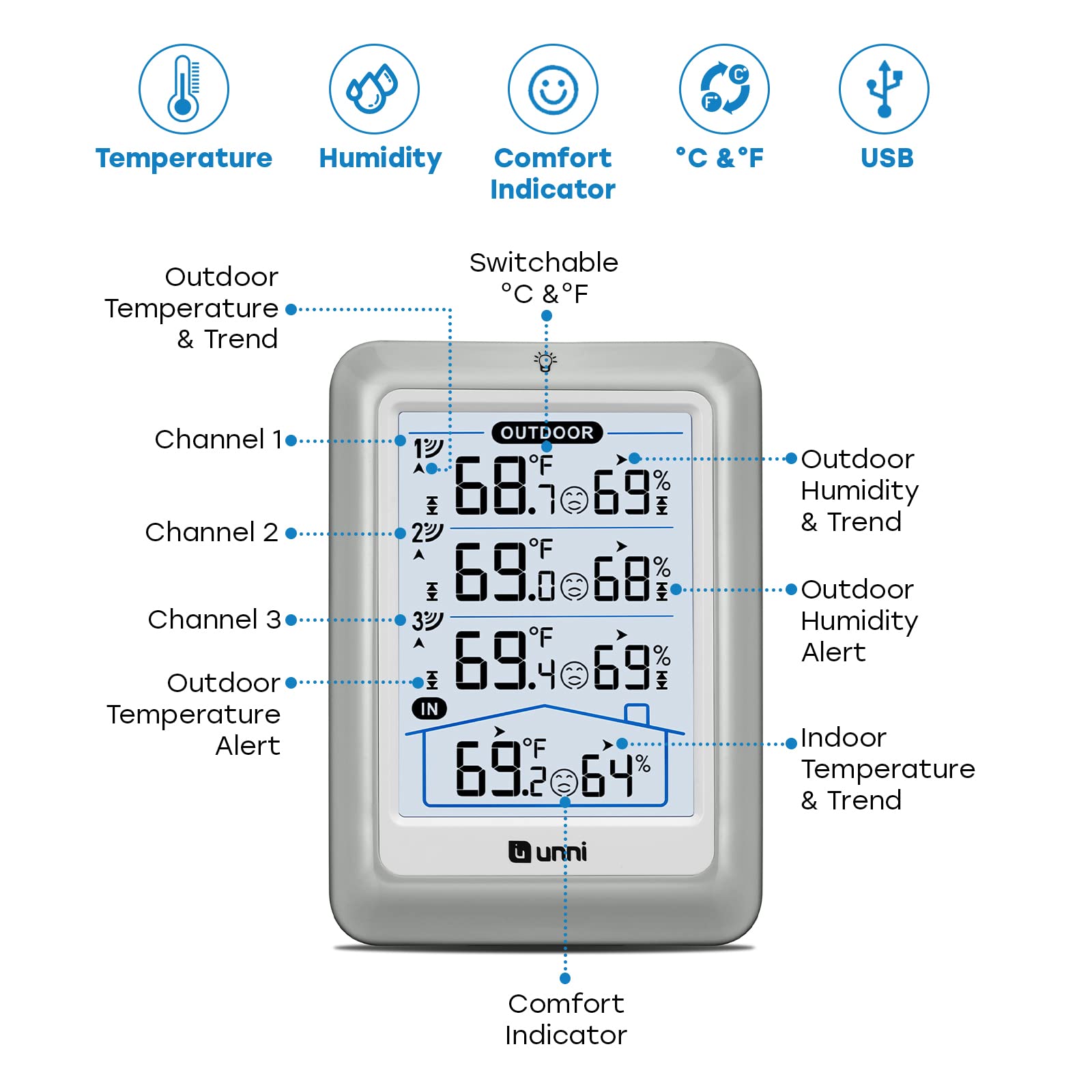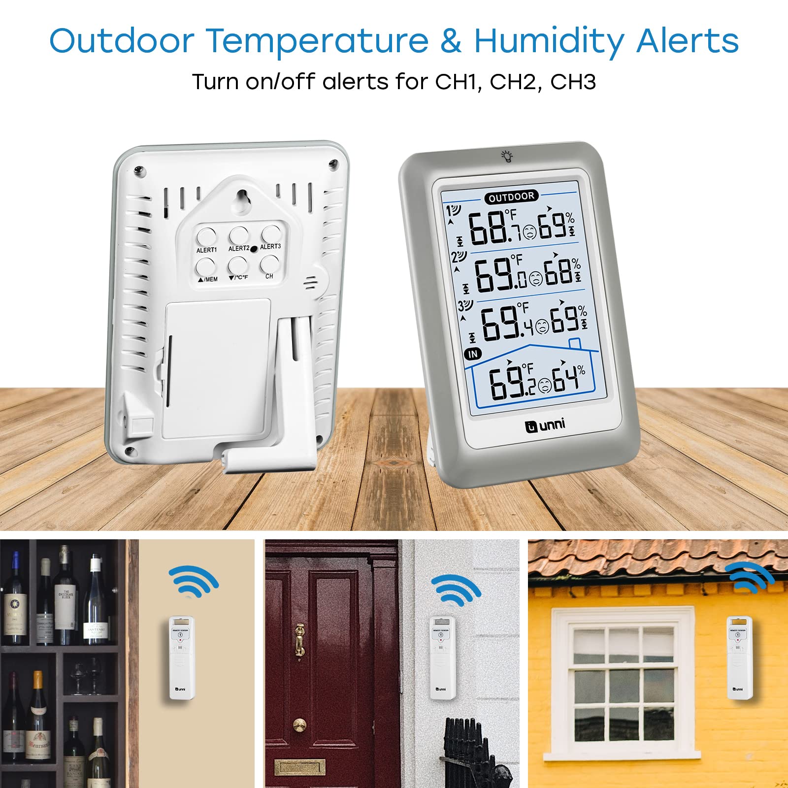 • DISPLAY 3 SENSORS DATA, TRANSMISIION 328FT/100M – Unni has advanced patented wireless technology that provides more powerful and steady data transmission. Wireless temperature humidity monitor updates and transmits temperature and humidity data up to 330 ft radius every 30 seconds, that will help you monitor all the locations you care about the most.