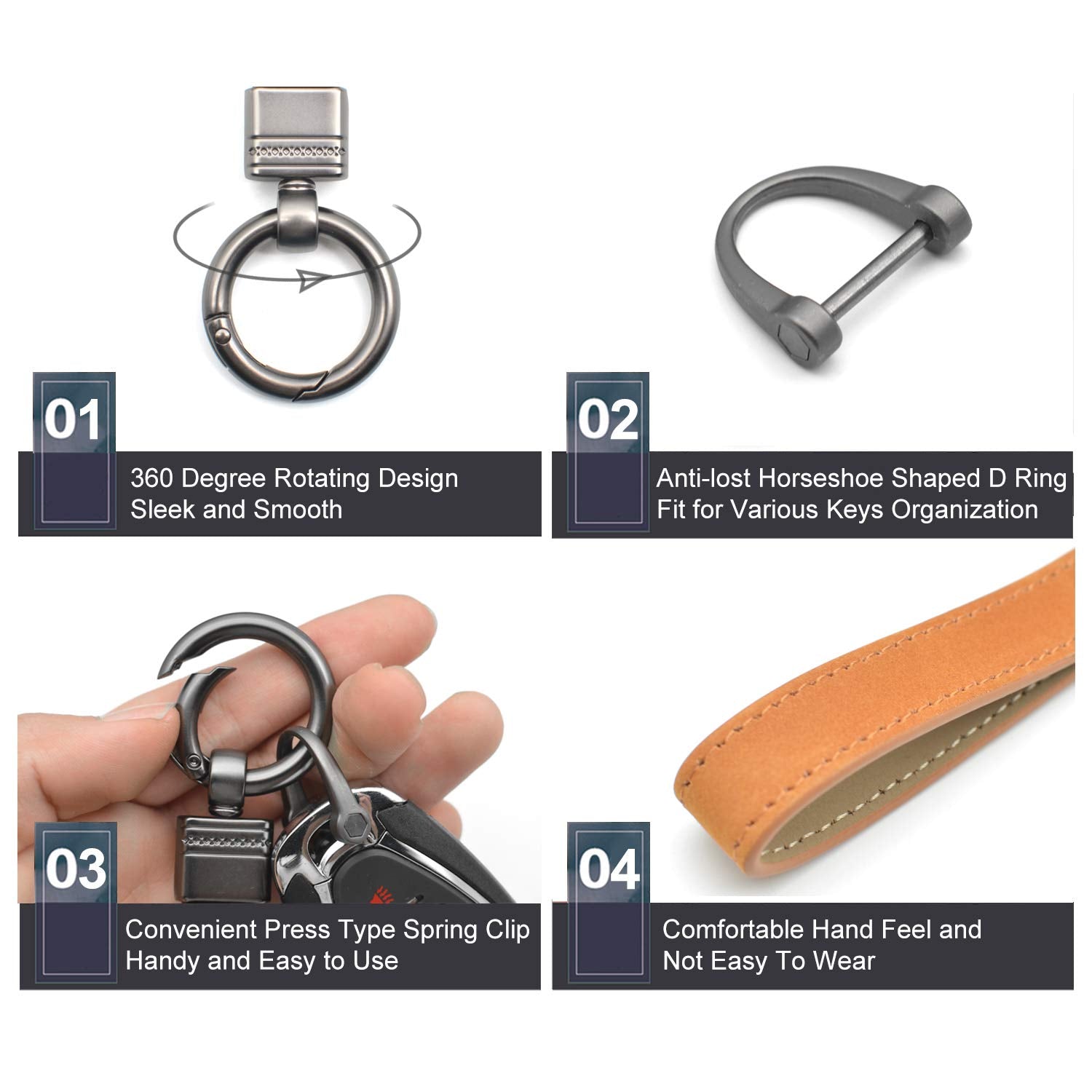 • Functionality - Genuine leather car keychain metal clip with 360 degree rotatable swivel, quick-release circle carabiner clip is easy to attach and remove your vehicle keys with D-ring and key rings.