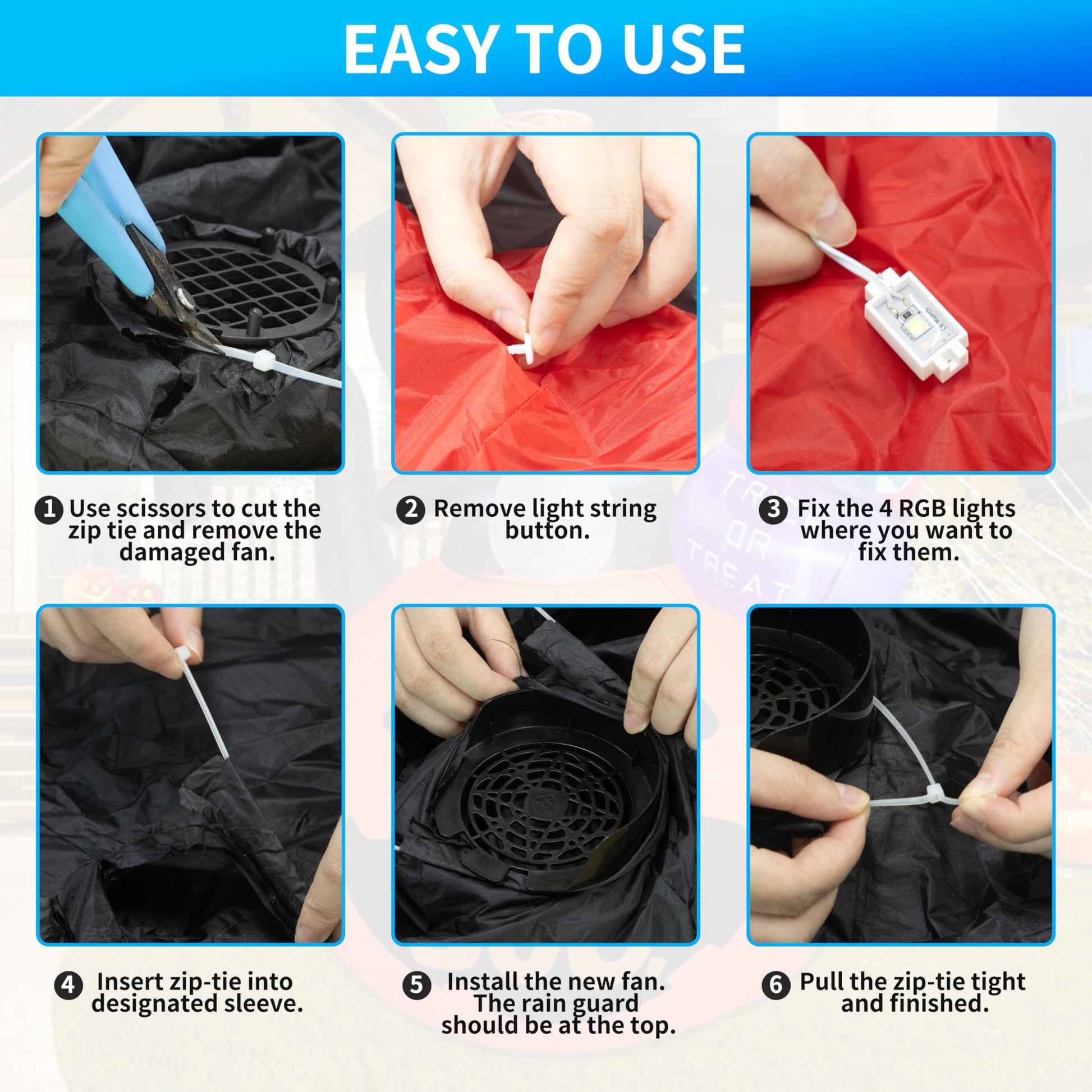 • Specification: Output: 12V 1A adapter; Output: 12V 1A fan blower; Rated Airflow: 28.1 CFM; Suitable for Tall:4-5FT,Dia: 2-6FT inflatable decoration; Tall:6-7FT,Dia: 2-5FT inflatable decoration; Tall:8-9FT,Dia: 2-4FT inflatable decoration