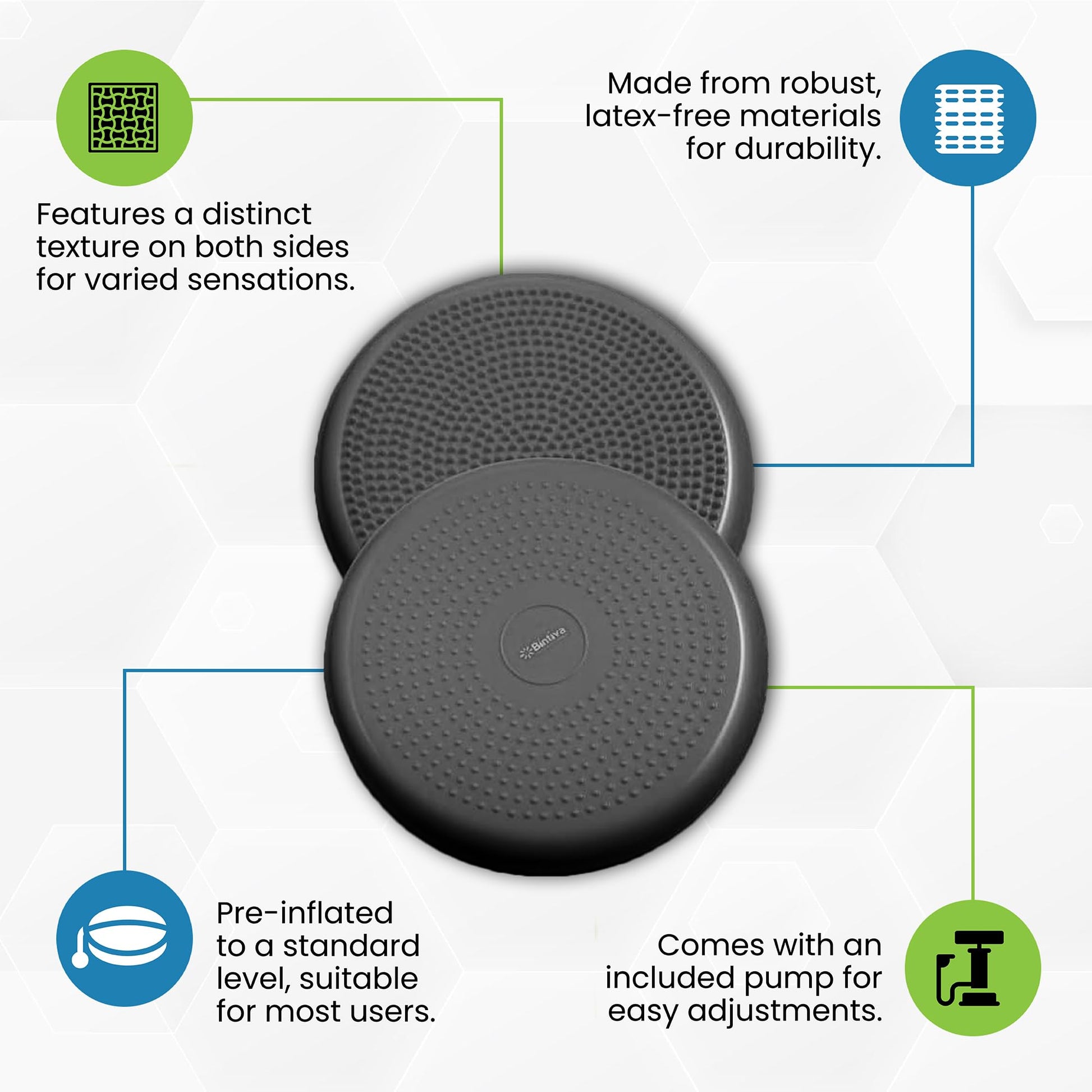 • Ships inflated, includes a pump for adjustments. Stability disc size: 13 inches / 33 cm diameter