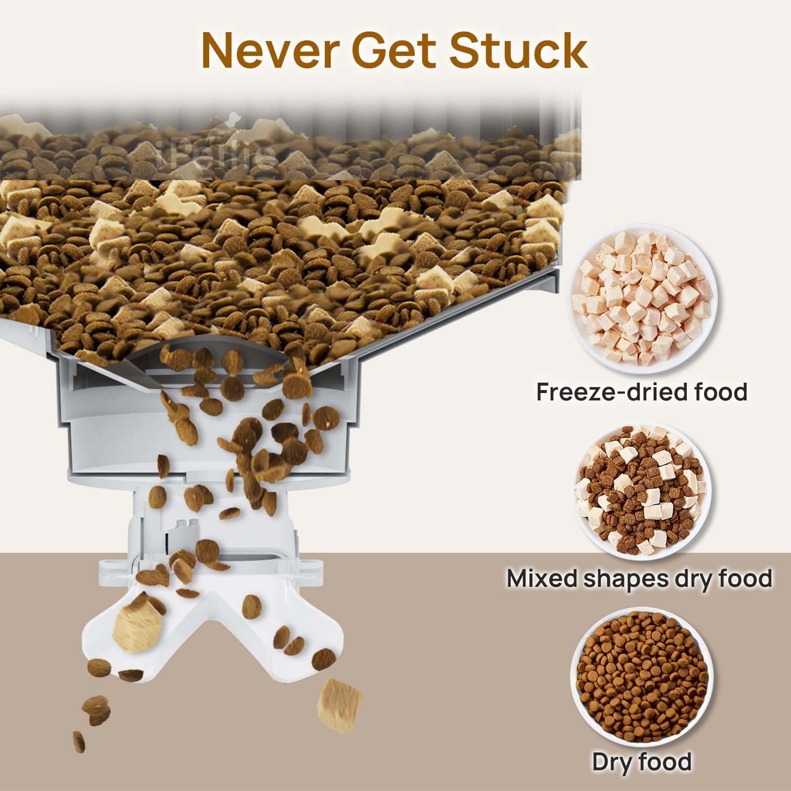 • Never Get Stuck: Equipped with a large torque motor, this dual automatic cat feeder eliminates the problem of food jams and missed feedings. Only use dry kibbles or freeze-dried food between 0.12”-0.51” (3mm-13mm) in size for best results.
