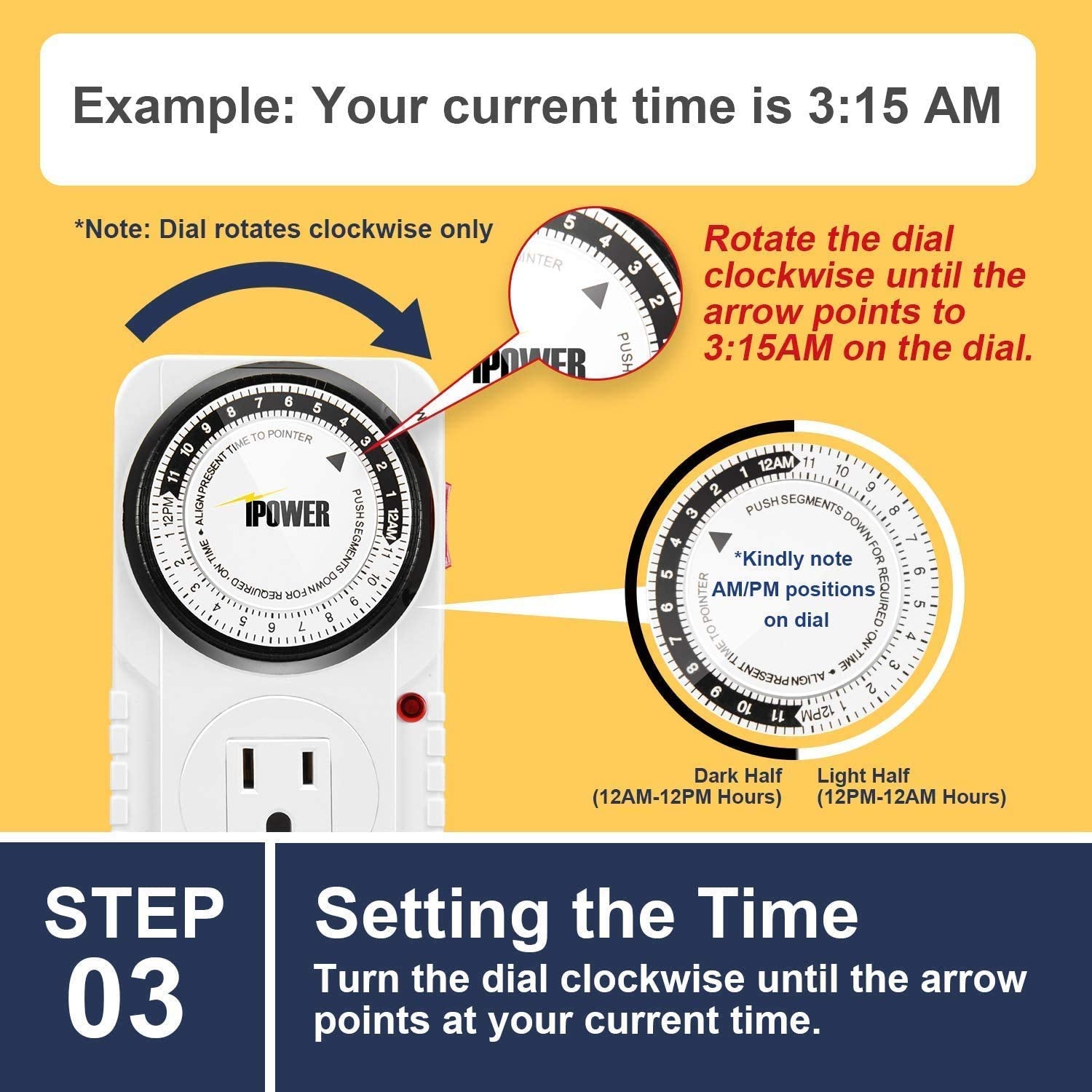 Details: iPower; 24 Hour Heavy Duty Plug-in Mechanical Timer can be easily used indoor only as kitchen timer, garden timer and more. Automates fans, lamps, lights, sprinklers, seasonal/ decorative/ holiday & Christmas lighting, illumination, heat, A/C, and other electronic appliances. The light timer can control up to 48 groups of ON/OFF switch. Several timing combinations can be set such as hourly, daily, weekly and group of the weeks. Settings Automatically Repeat Every 24 Hours Specifications: Length: 4.7 inches Width: 2.75 inches Height: 3 inches Weight: 8 ounces Rated Voltage: 125VAC, 15A, 60 Hz, 1/2HP, 1725W Life's a Breeze with iPower Always on schedule, always be cool Automate lights to turn on and off, morning and night Automate AC, heater or fans to turn on before arriving home Automate coffee maker to start before you get up Automate battery chargers to avoid over-charging; extends the life of the battery Small Red Led light is Output Indicator