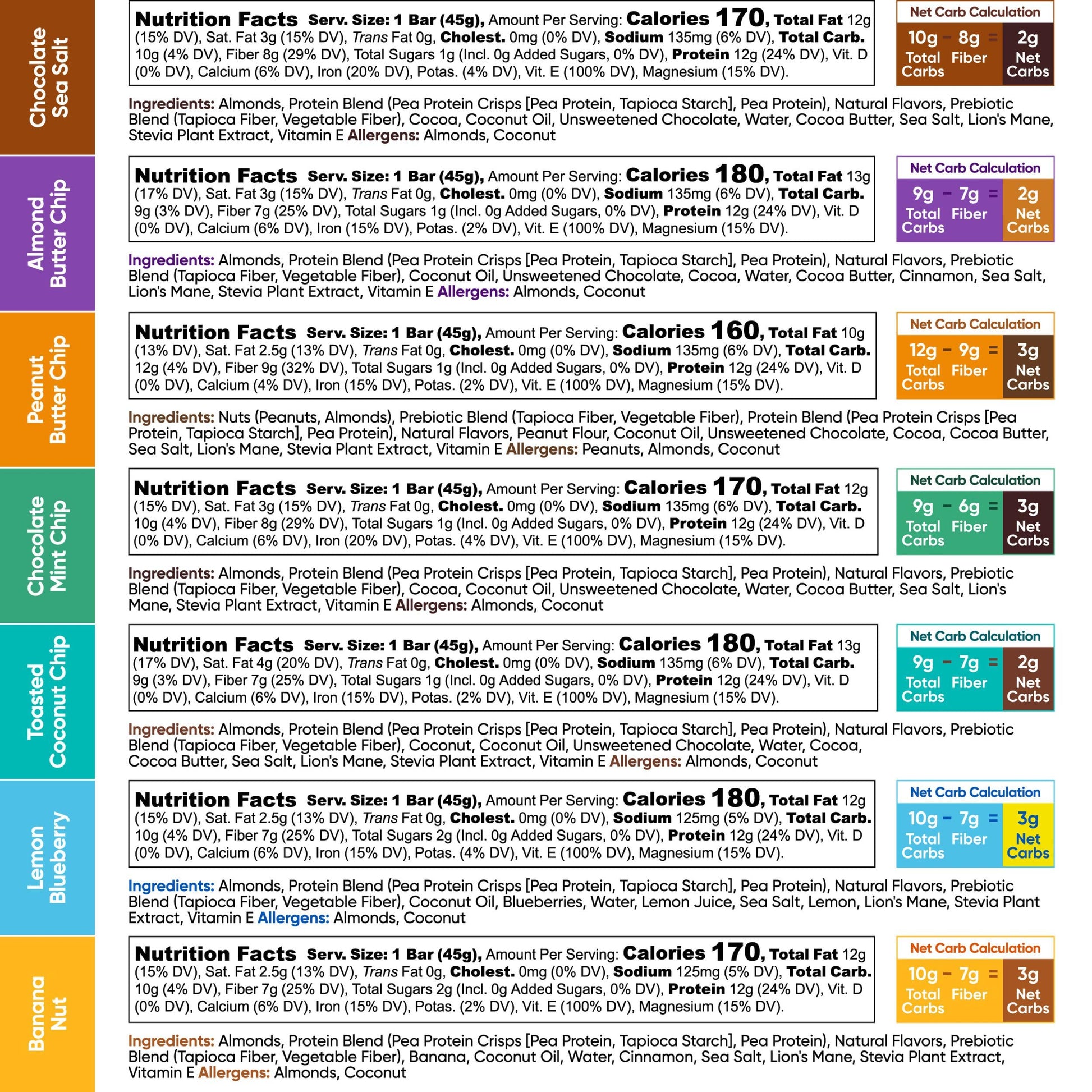 • KETO FRIENDLY SNACKS w/ Only 2-3g Net Carbs in Every Serving - Net carbs are carbs that are absorbed by the body, and our keto treats come with only 2-3g of net carbs in every serving. Each keto plant based protein bar is packed with 9-12g of total carbs, 6-9g of fiber, 10-13g of fats & 160-180 calories. Try our 7 flavors Chocolate Sea Salt, Peanut Butter Chip, Almond Butter Chip, Toasted Coconut Chip, Lemon Blueberry, Banana Nut, and Chocolate Mint Chip