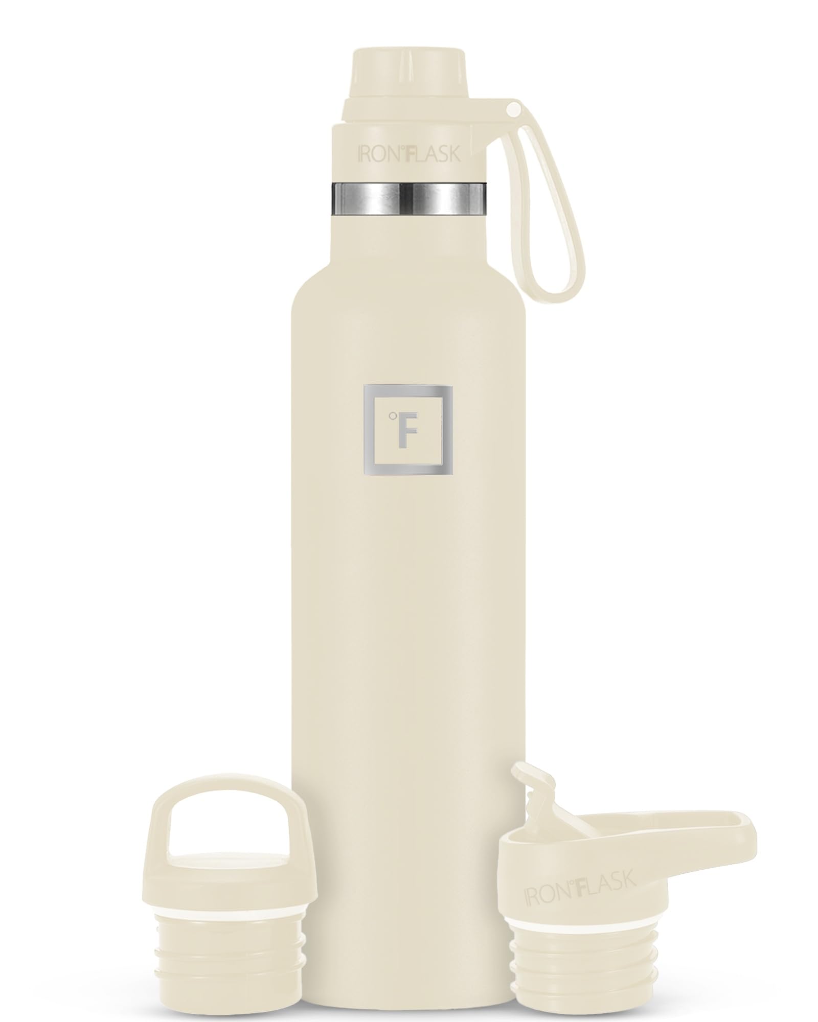 IRON °FLASK Camping & Hiking Hydration Canteens - 3 Lids (Narrow Spout Lid) Leak Proof Vacuum Insulated Stainless Steel - Hot & Cold Double Walled Sports Water Bottle - Cashmere Cream, 24 Oz