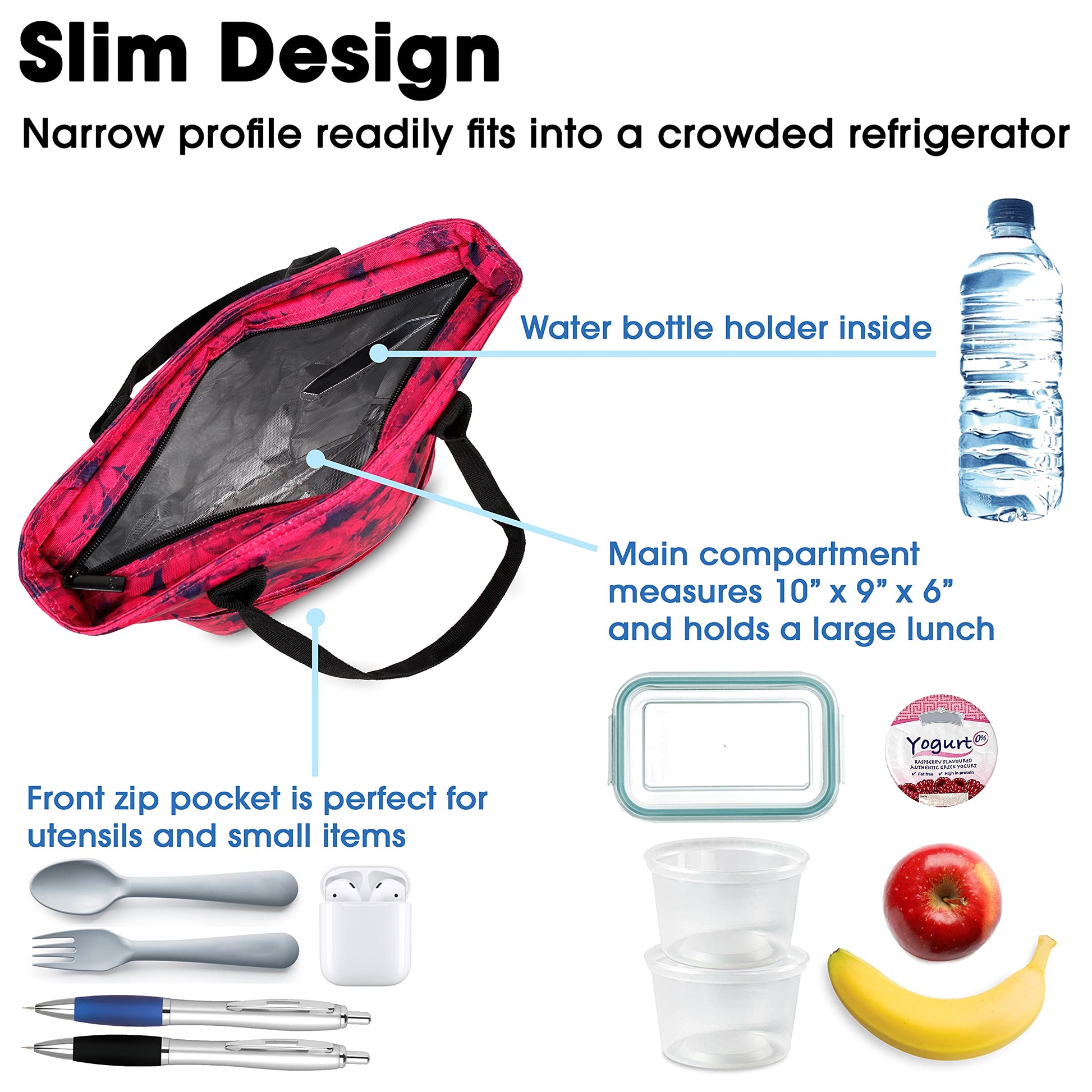 • A TYPICAL LUNCH PACKED – Cooler lunch bag holds a 12-16 oz drink, a yogurt cup, a fruit cup, a small cottage cheese container, an apple, and 2 frozen gel packs