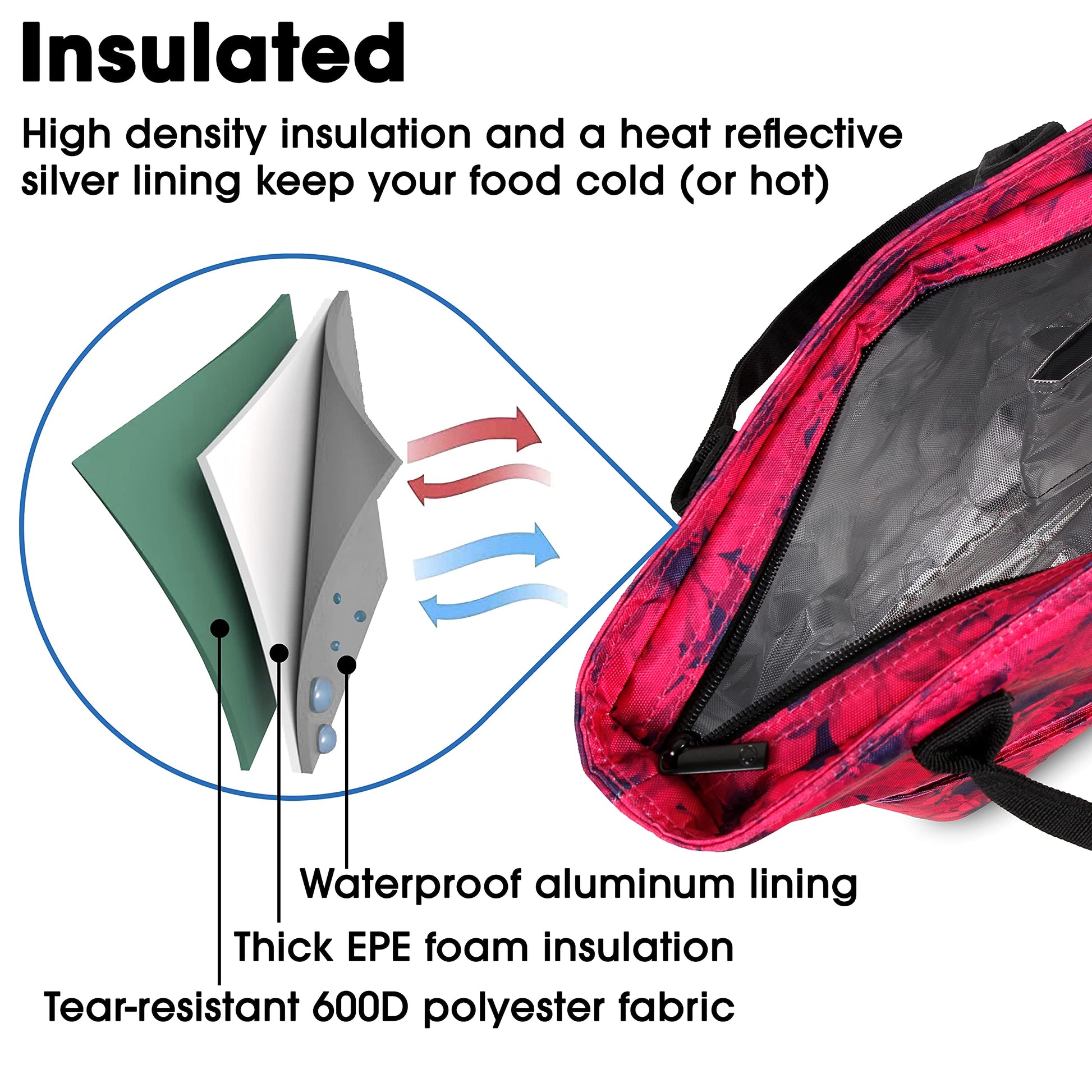 • INSULATED - High density insulation and a heat reflective silver lining keeps your food cold (or hot) in this thermal lunch bag