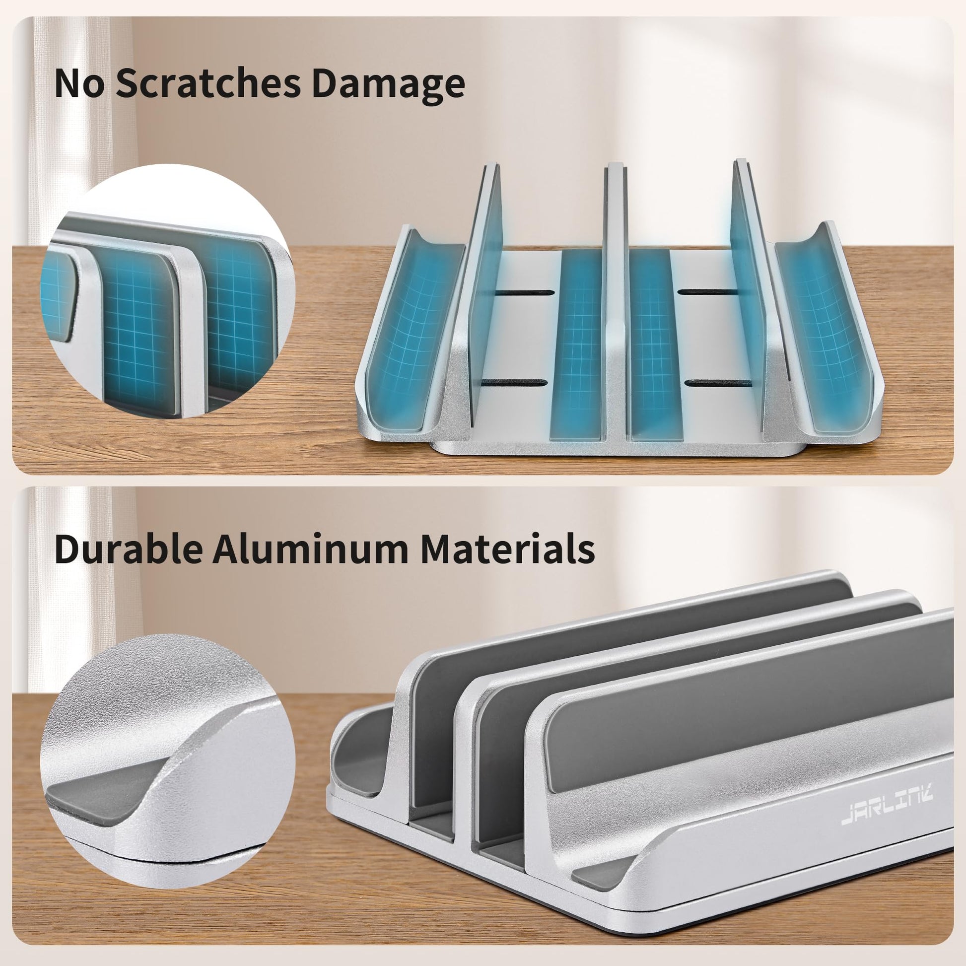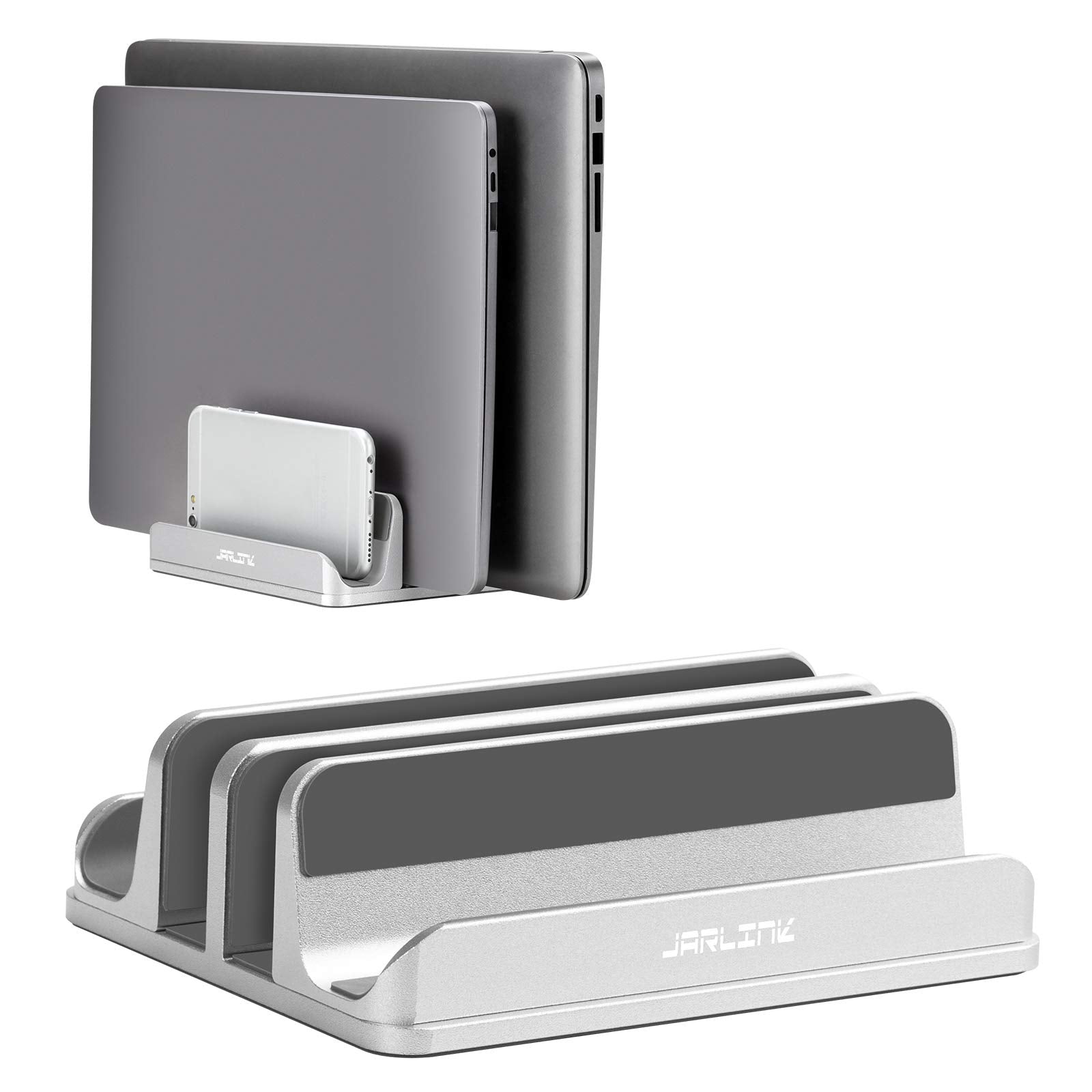 JARLINK 4-in-1 Adjustable Vertical Laptop Stand Holder, Aluminum Dual Slots Laptop Rack for Desk, Space-Saving Organizer for All MacBook, Surface, Chromebook, and Gaming Laptops (Silver)