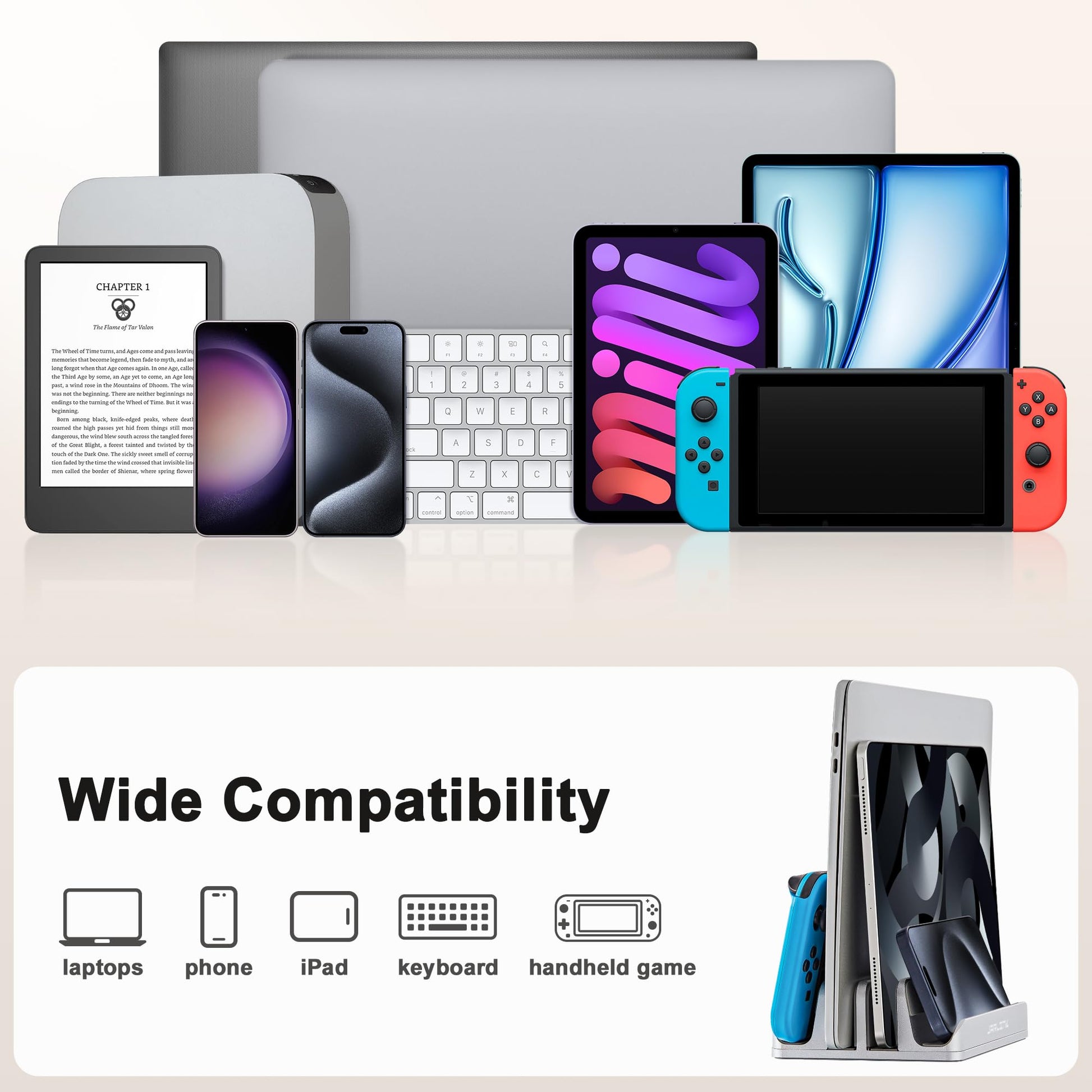 • Innovative Dual Slot Design: This 4-in-1 stand is engineered to hold two laptops and two cellphones vertically simultaneously, doubling your productivity. It uses your desktop space efficiently, keeping your workspace tidy and organized.