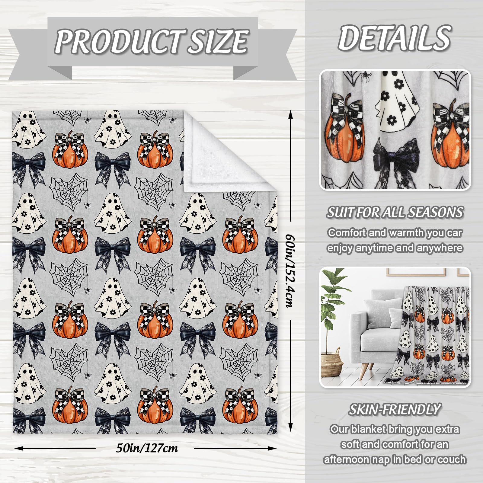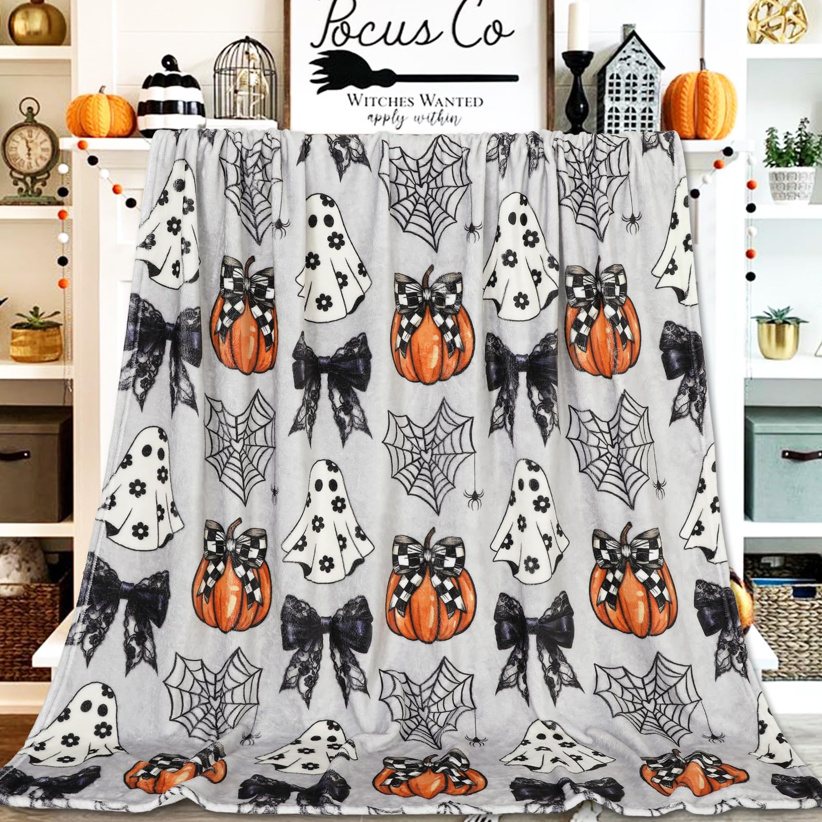 JarThenaAMCS Halloween Flannel Blanket 60 x 50 Inch Ghost Pumpkin Bow Decorative Throw Blanket Soft Gray Blanket for Home Chair Sofa Couch Bed
