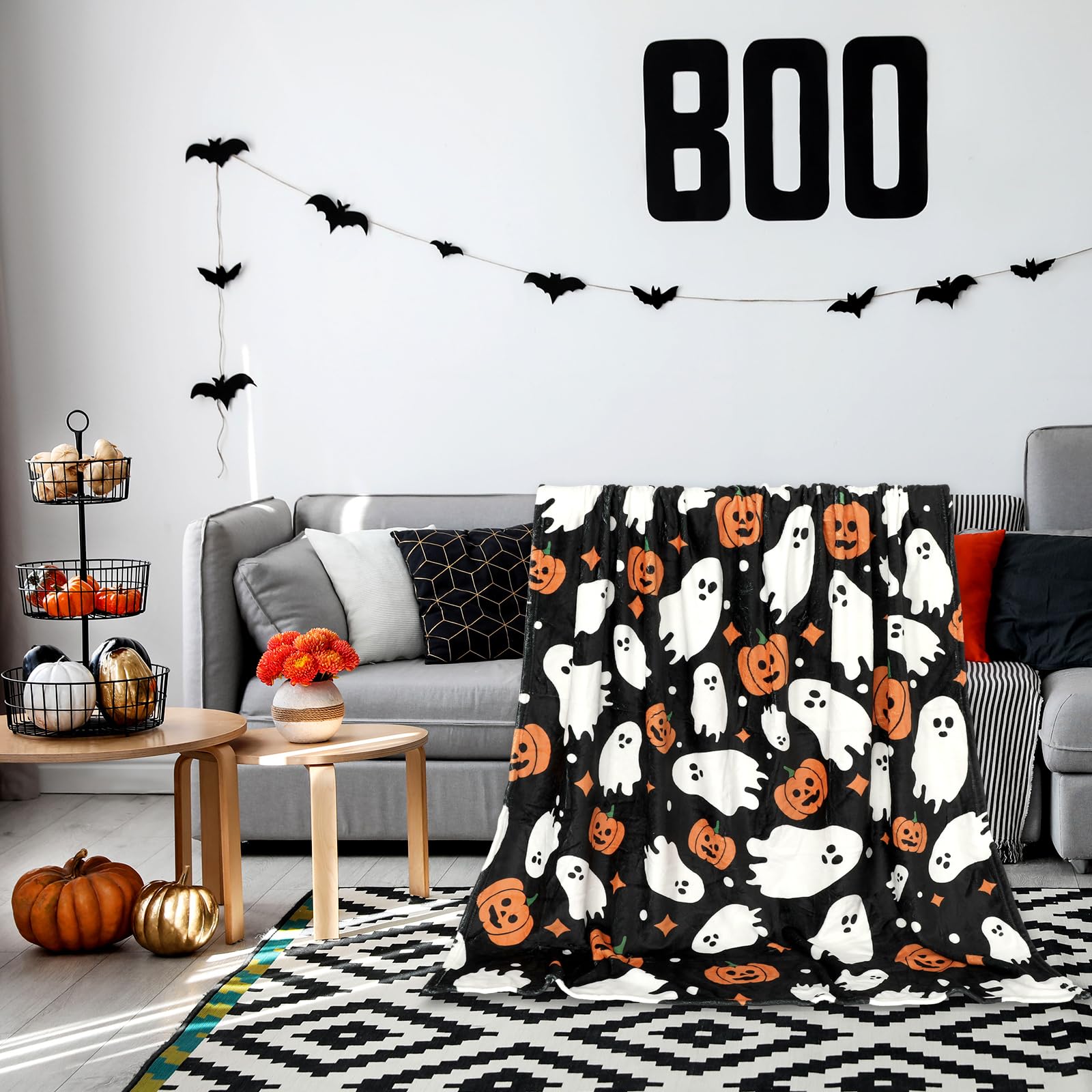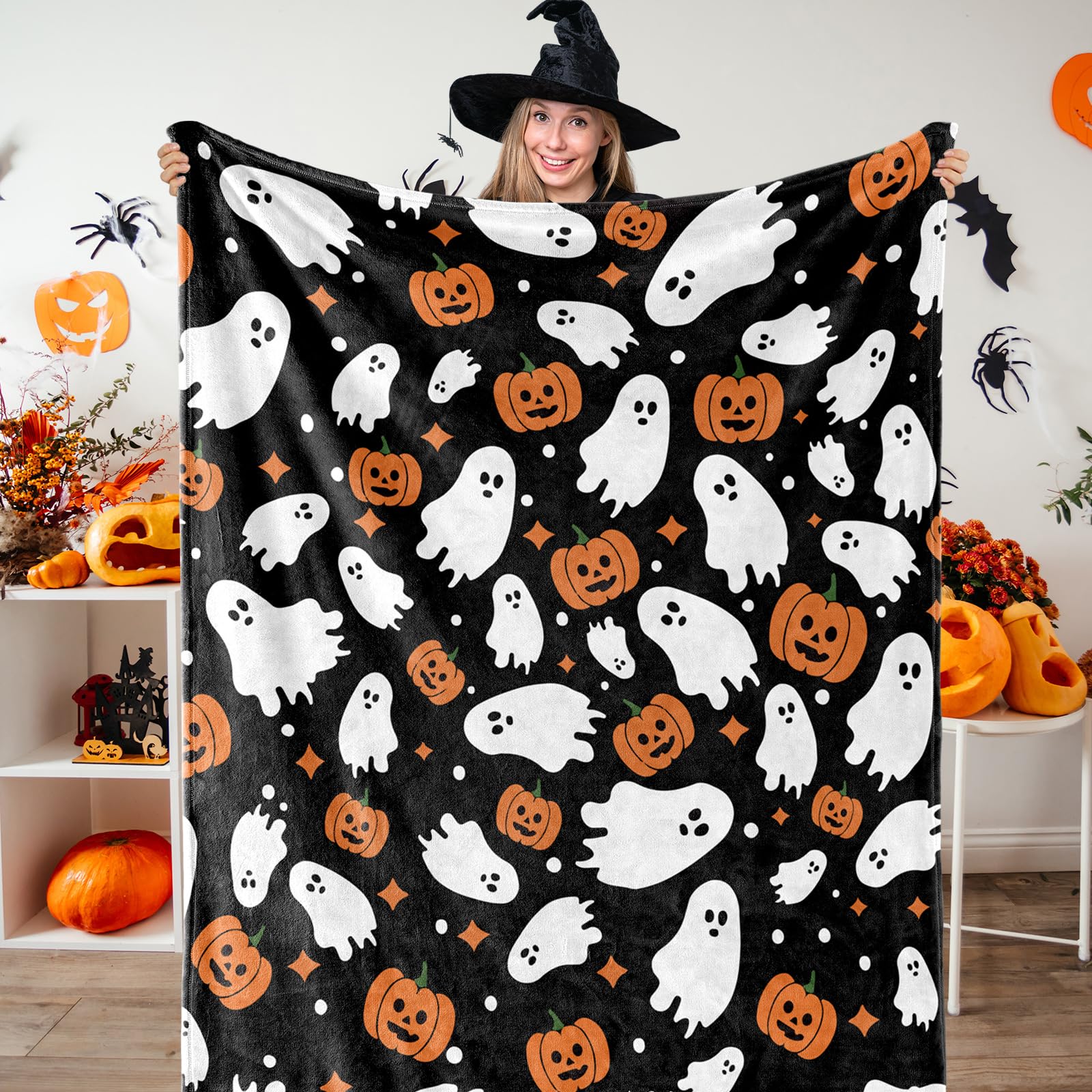 JarThenaAMCS Halloween Fuzzy Flannel Blanket 60 x 50 Inch Ghost Pumpkin Throw Blanket Black Soft Blanket for Farmhouse Home Chair Sofa Couch Bed
