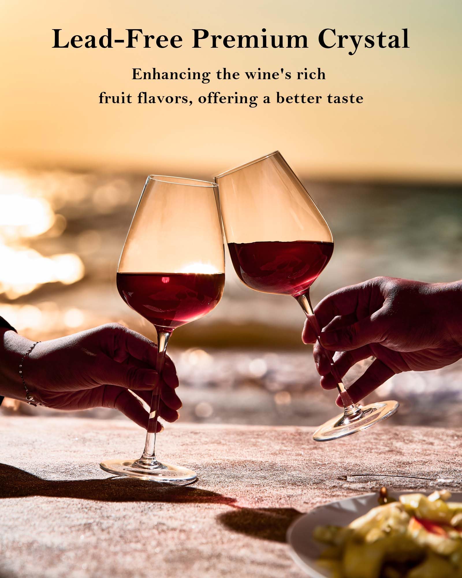 • Classic Bordeaux Wine Glass Design Makes Your Wine Taste Better: The Golden Ratio Design allows you effortlessly swirl your wine and let it breathe and release its delicate aromas, while also elegantly guiding the wine into your mouth. The unique shape of the glass helps to balance the tannins in red wine, reducing bitterness and enhancing the wine's rich fruit flavors
