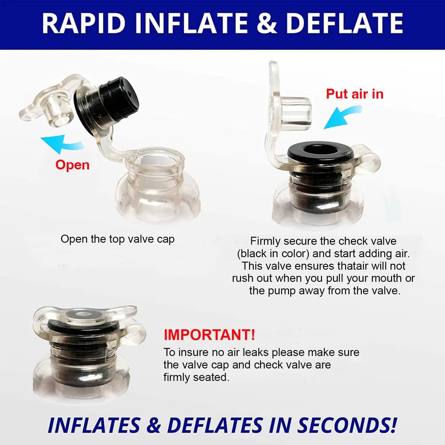 • EASY TO USE: Large 2-way valve x1; Promotes quick inflation and deflation; Be sure to fully seat the caps to maintain inflation