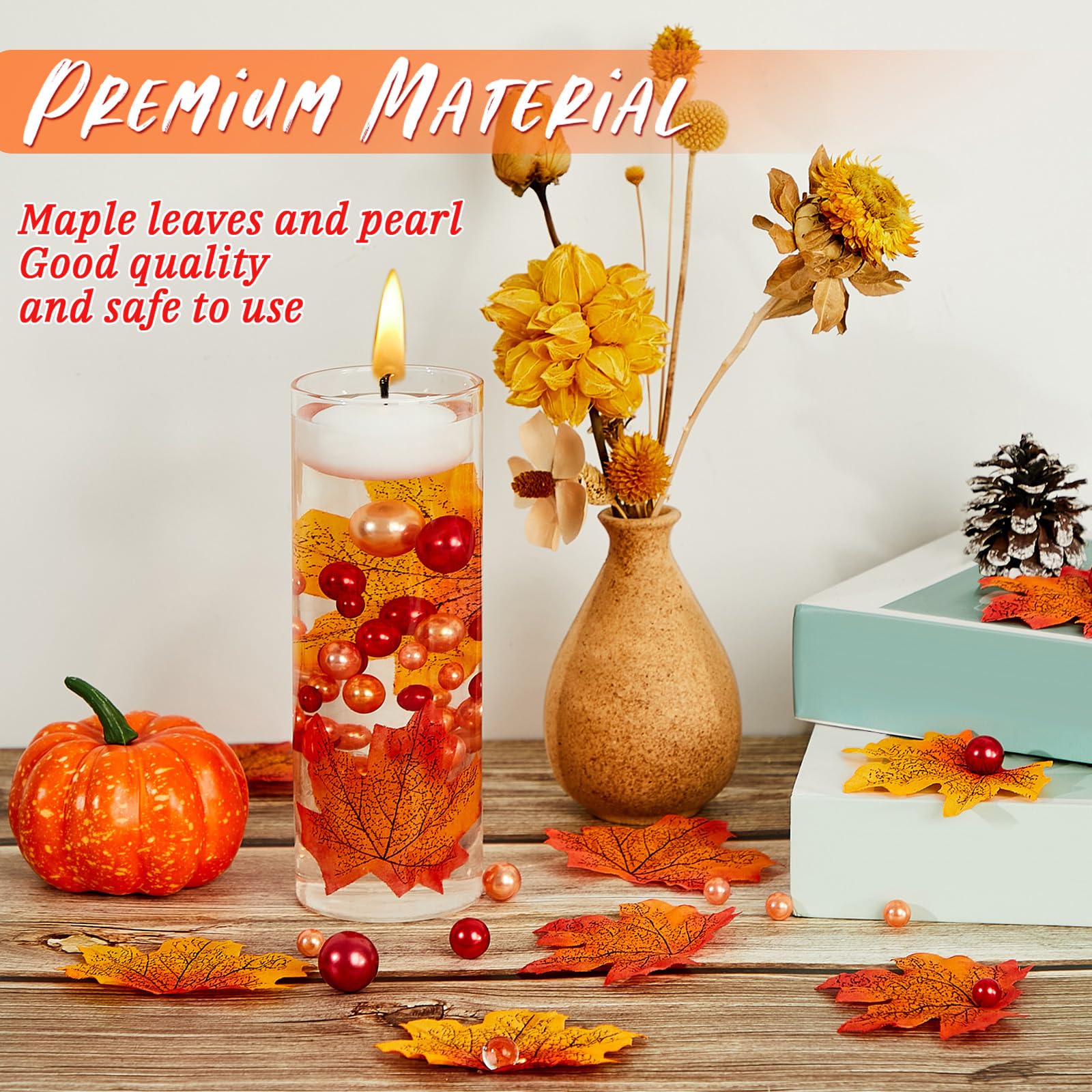 • Rich content: you will receive a total of 116 pieces fall vase filler, 56 pieces faux pearls, 60 pieces multiple leaf shapes, rich styles and sufficient quantity to meet your needs for candles, vase fillers and so on, Note: This set does not include clear beads. If you need to achieve this floating effect, you will need to purchase them separately