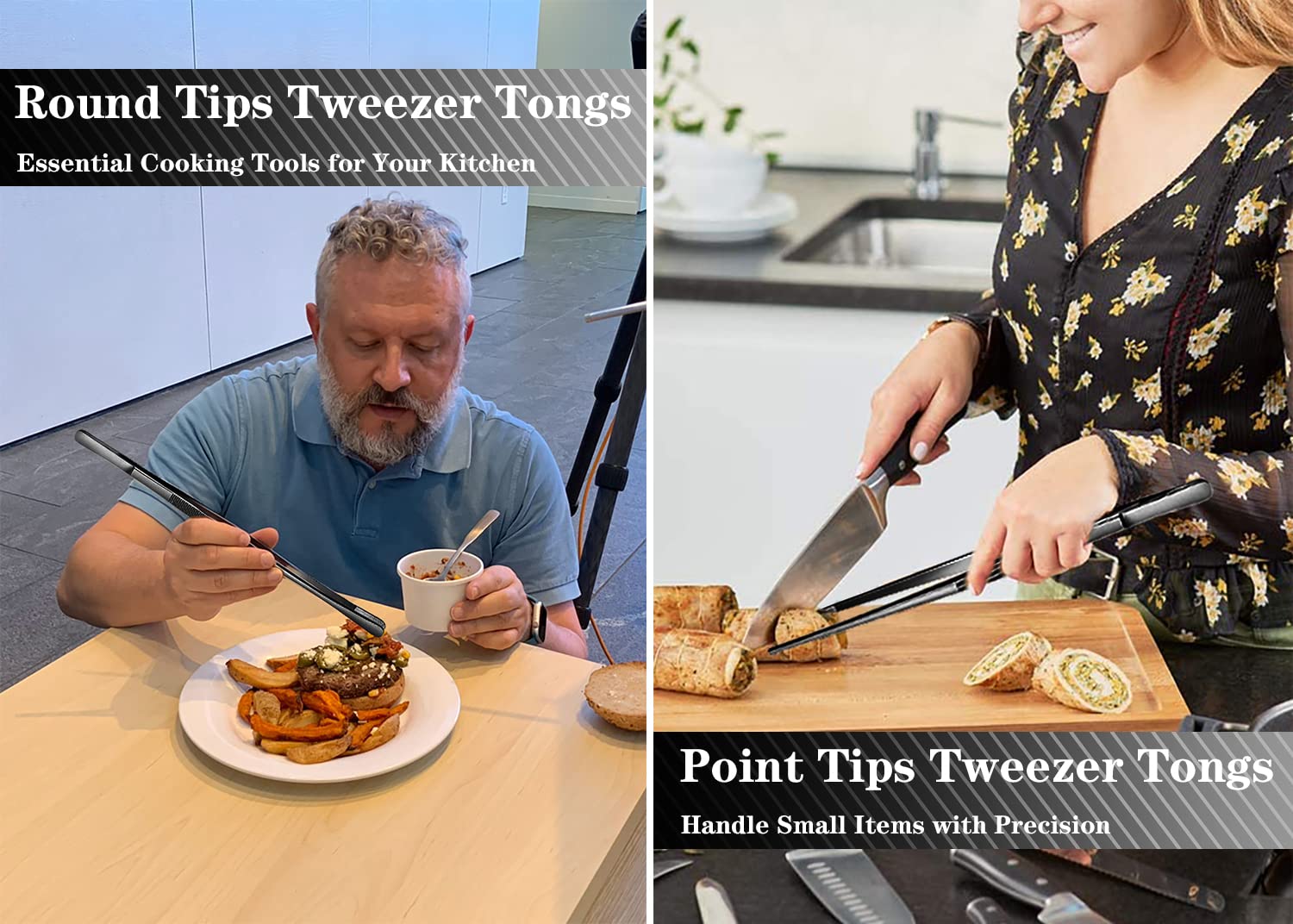 • PACKAGE CONTENT - Each packet purchase include 2 types 12-inch black kitchen tweezers for cooking. The rounded tips tweezer is blunt enough to be safe to touch or even press, and holds the food securely, minimizing the risk of food slipping and sliding. The pointed tips tweezer have a fine-tipped design to help chefs create delicate dishes.