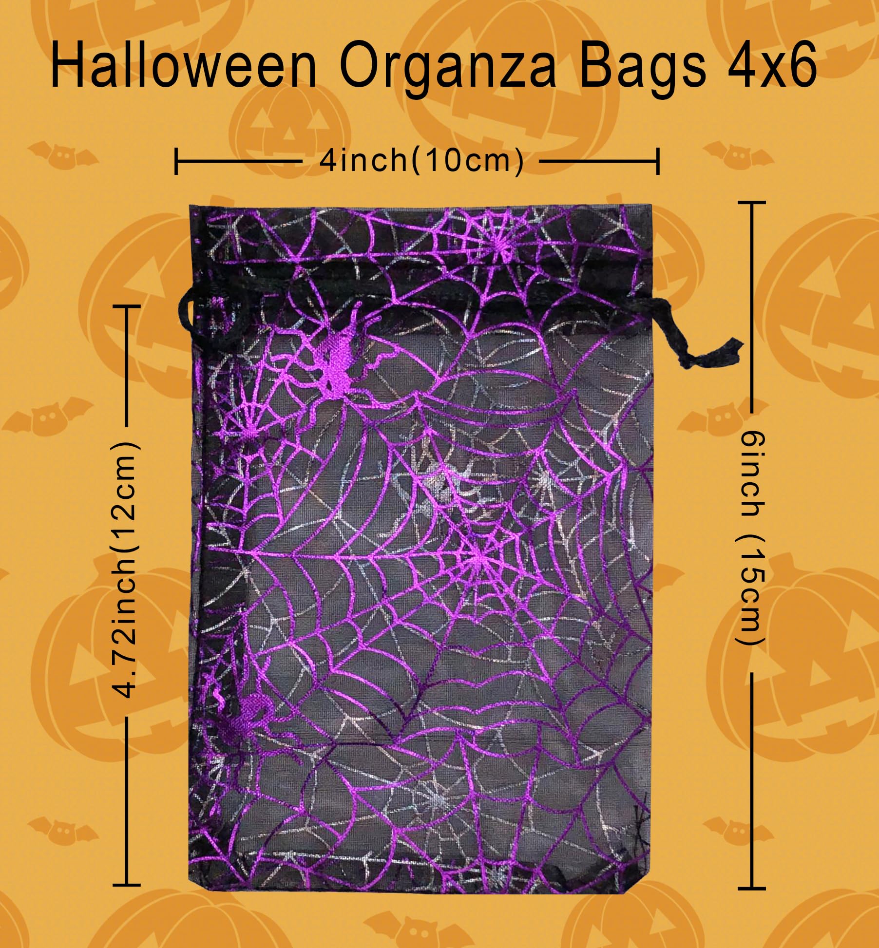 Package:100pcs. Size:approch 4x6 inches. Color:Mix 5 color with beautiful howlloween pattern print. Material:organza.