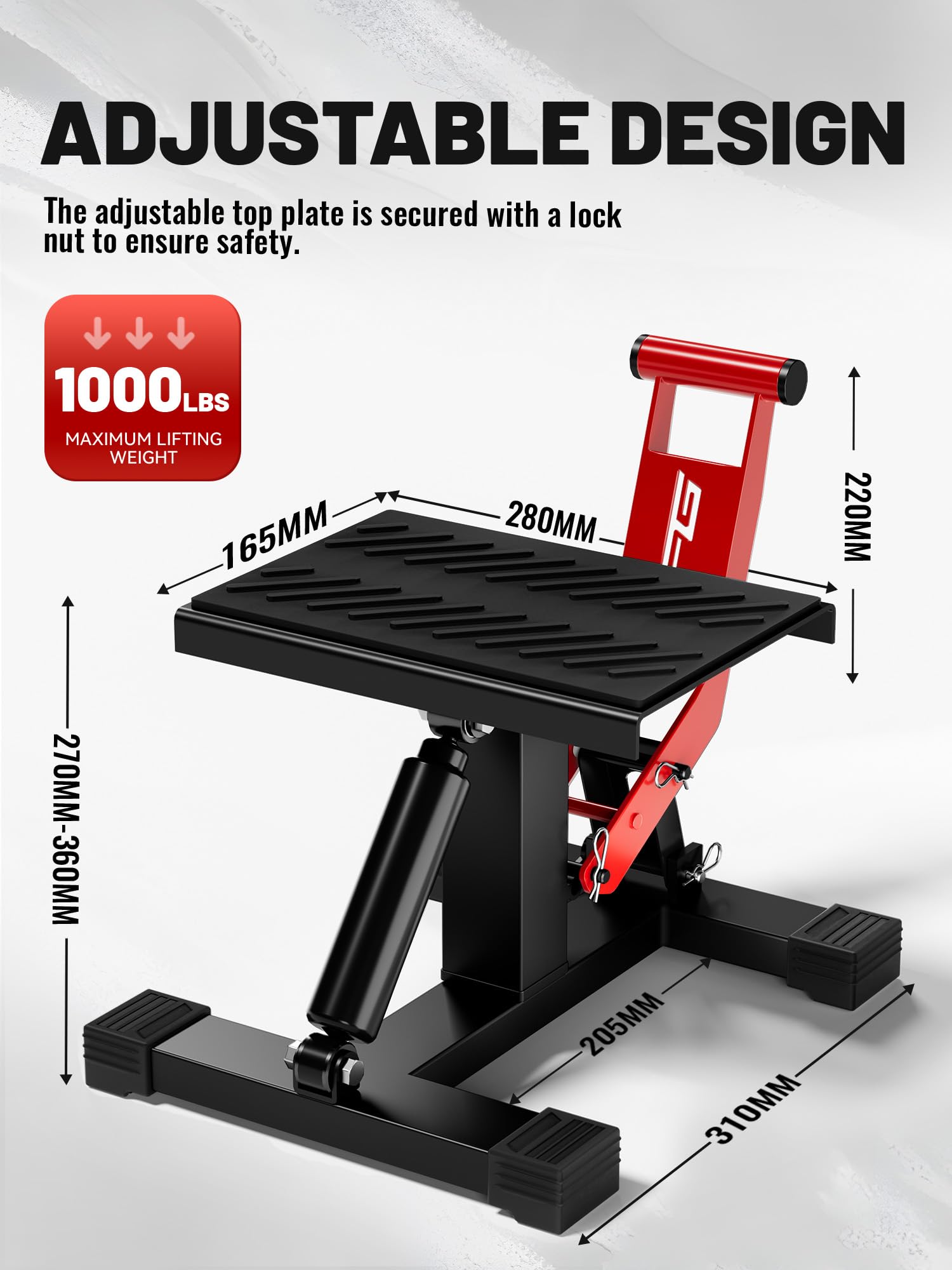 • ADJUSTABLE DESIGN: Dirt bike lift stand adjustable range: 27 cm (10.6 in) - 36 cm (14.1 in). Maximum lifting weight is 450 kg (1000 lbs). Top plate size: 28 cm (11 in)* 16.5 cm (6.5 in). The adjustable top plate is secured with a lock nut to ensure safety.