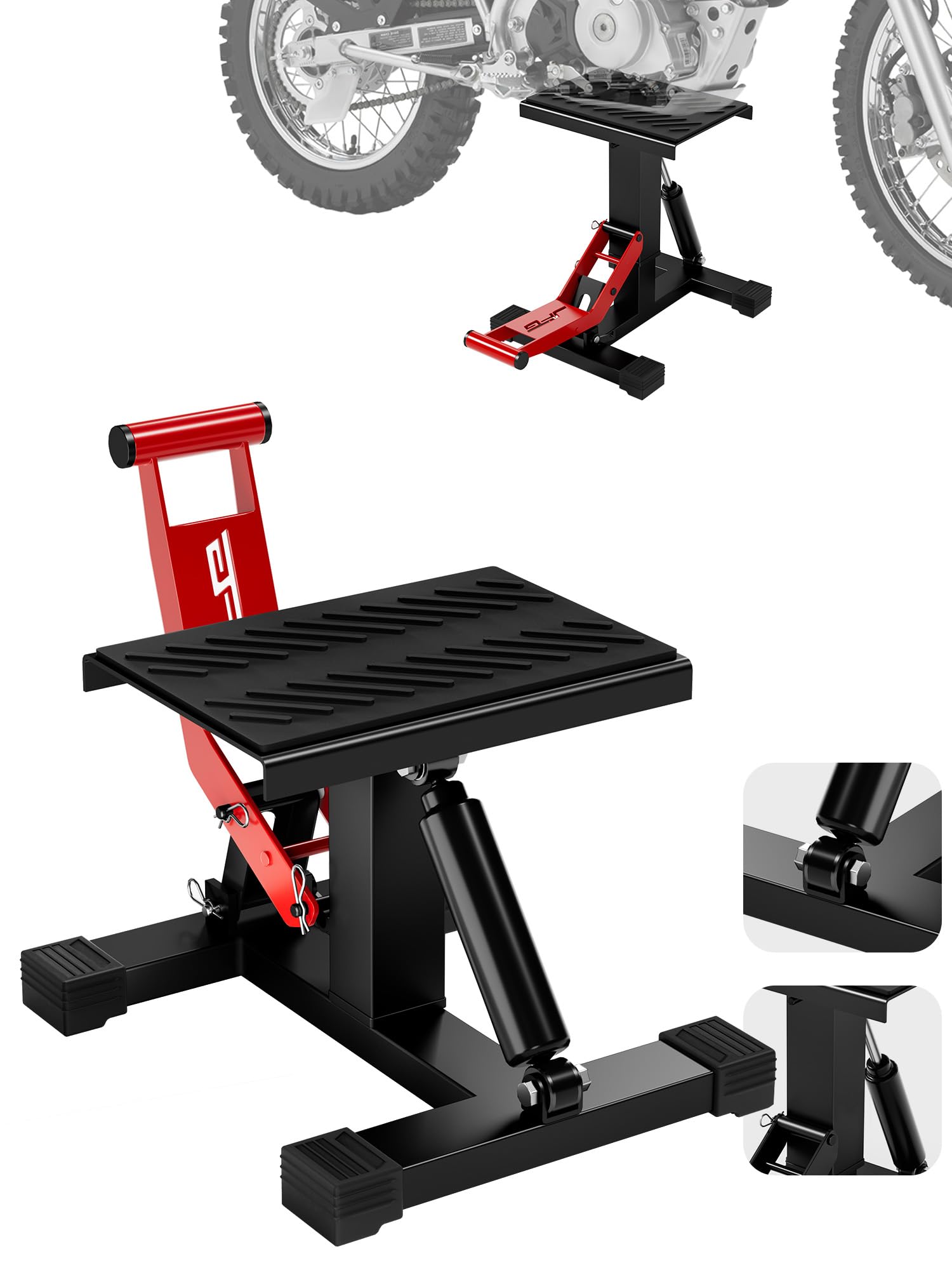 • ANTI SLIP DESIGN: The top surface of the dirt bike lift stand has a durable rubber pad that can protect the contact area between the motorcycle and the bracket from being bumped. The bottom of the bracket also has four anti slip designs that can maintain stability, prevent sliding.