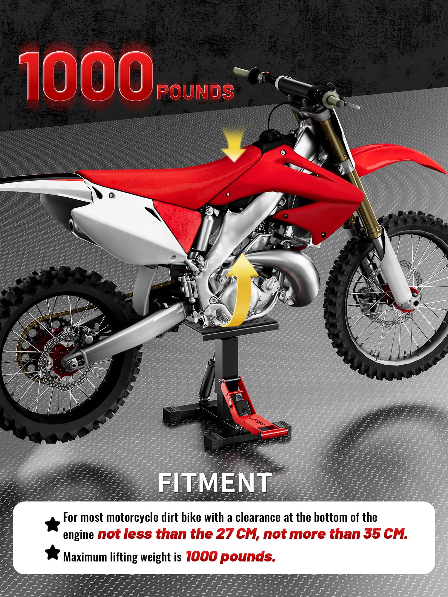 • FITMENT: Dirt bike lift stand load capacity is 1000 lbs, compatible with most dirt bikes. Please measure the minimum ground clearance at the bottom of the motorcycle engine to ensure that it is not less than the minimum height of the bracket.