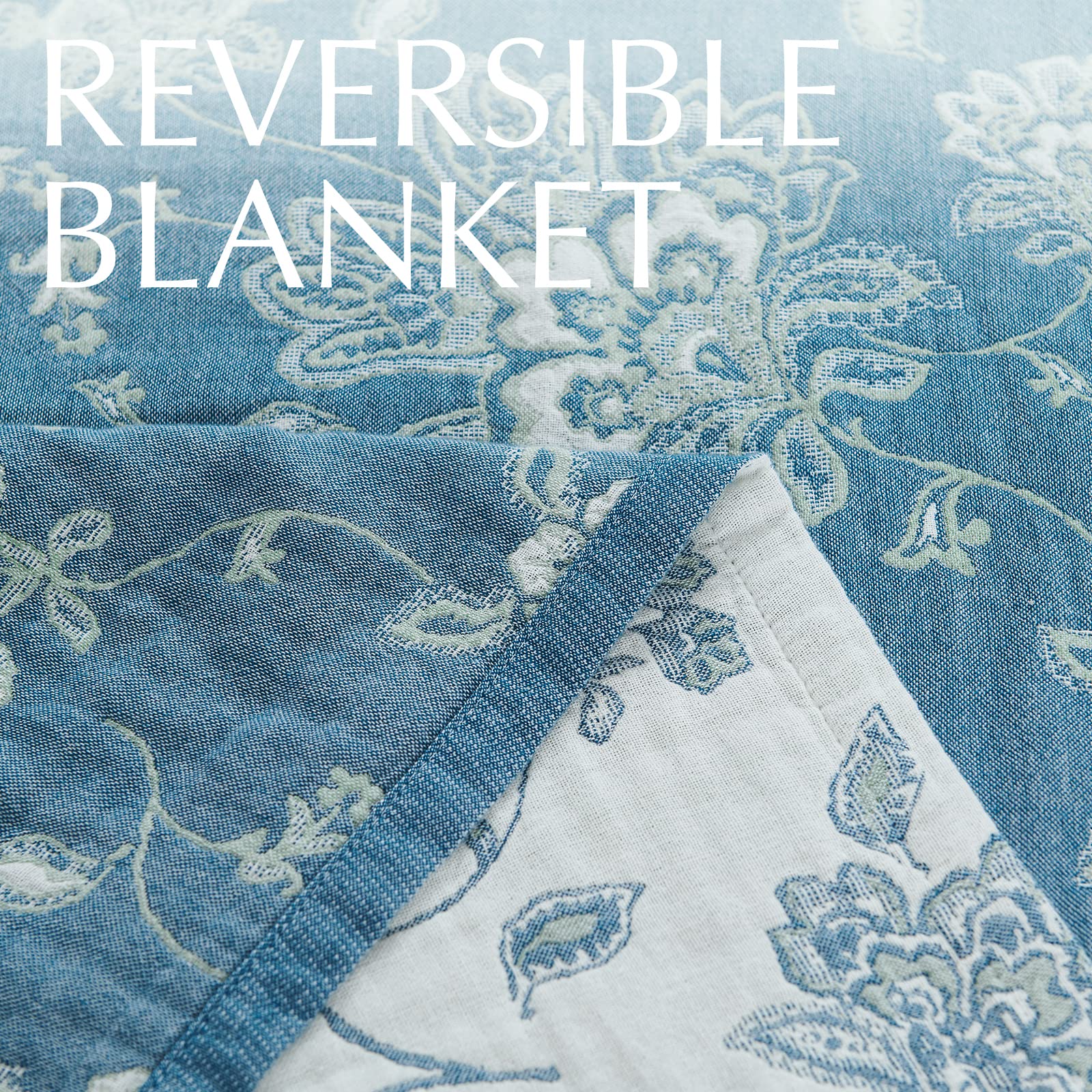 jinchan Boho 100% Cotton Muslin Twin Size 60x80 Inches Blanket Lightweight 4-Layer Quilted Soft Blue and White Floral Throw Blanket Green Accents Reversible Comfy Flower Summer Couch Bedroom Decor