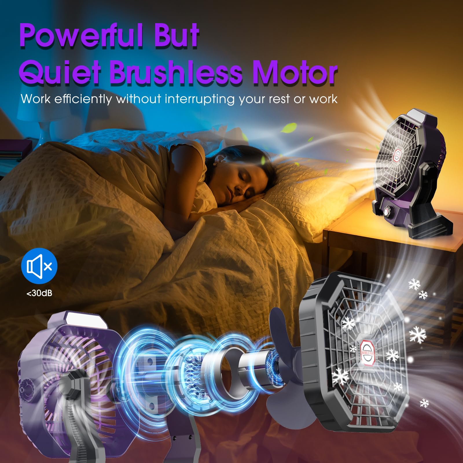 • 【Quiet but Powerful Wind】- The portable fan adopts lastest quiet brushless motor technology, providing high-speed and strong airflow at the lowest noise(<30 db), which would not affect your sleep or do anything.