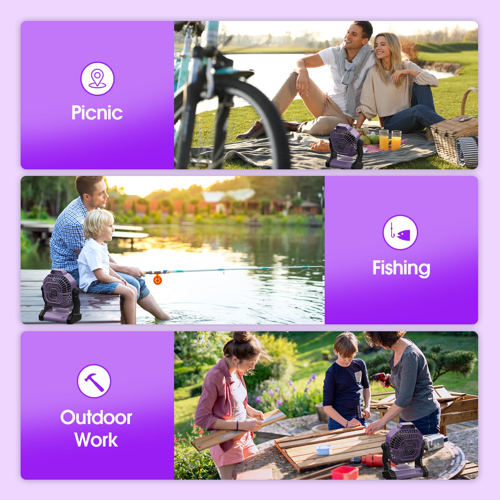 • 【One-touch Operation】- Our battery powered fan adopts a one-button stepless speed regulation design, no need to read the manual, and can be easily used by children and the elderly.