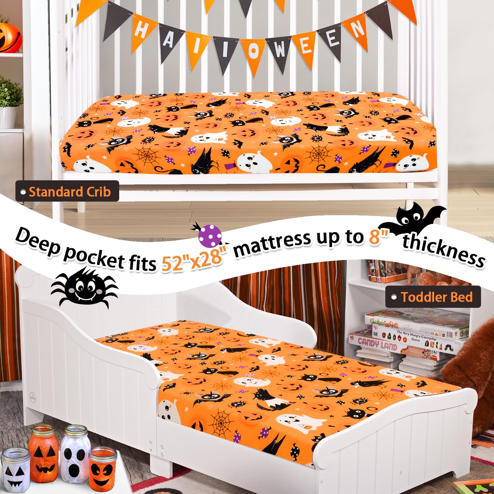 • 【Soft Halloween Crib Sheet】: Made with love and care, baby crib sheet is crafted from premium quality material, gentle on your baby's delicate skin, providing them with a comfortable and safe sleeping environment. And crib mattress sheet 52x28 inch make it suitable for most cribs and toddler bed. Its deep pockets make sure the crib mattress cover fit standard mattress thick. Crib sheet is not too tight so that you can pull it on and off easily by yourself.