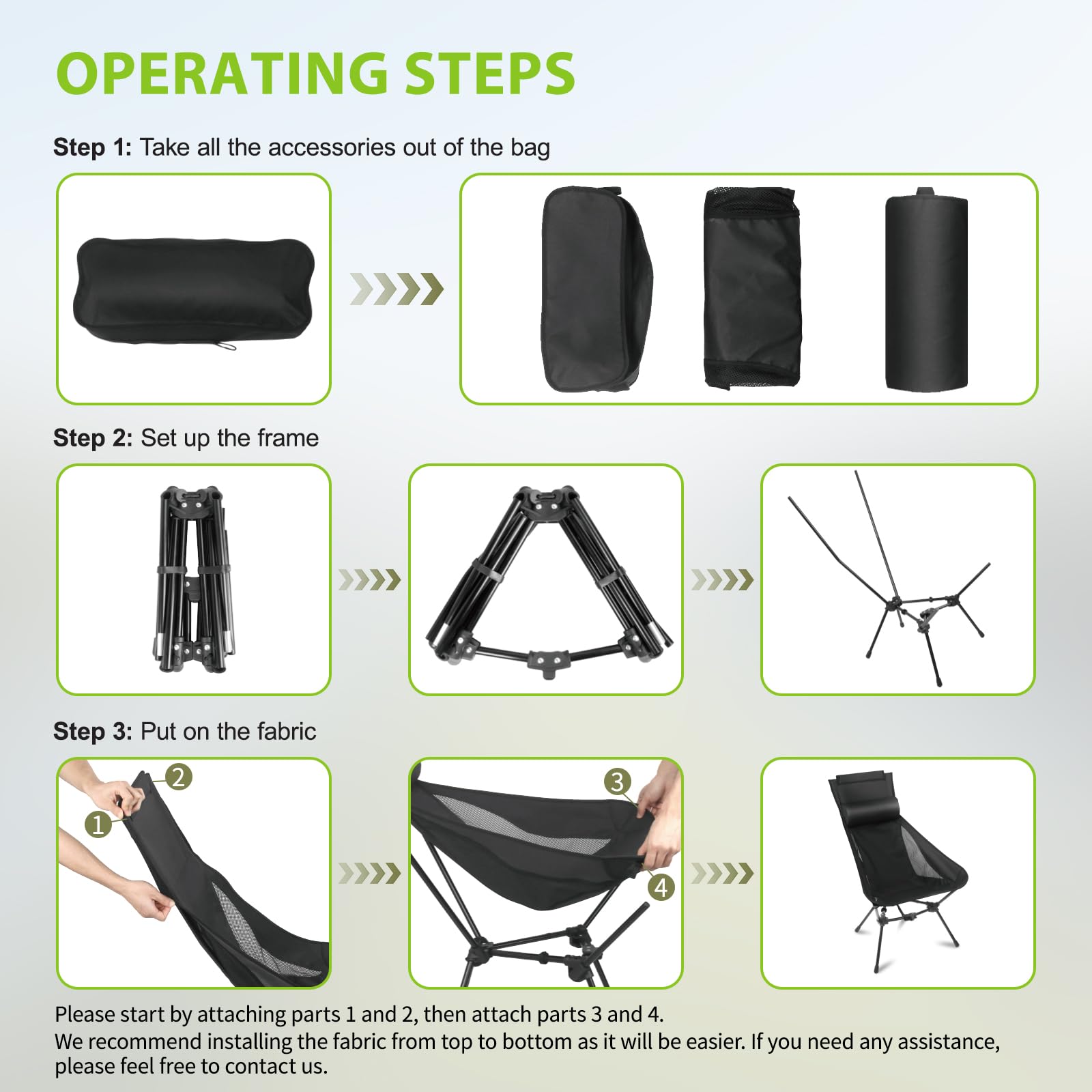• Effortless Assembly & Package List: Our camping chair is designed for easy setup – simply unfold the frame and slip on the fabric seat. Detailed instructions in the user manual are available for your reference, ensuring a quick and easy installation process. With just a few practice rounds, you can master the setup in under a minute! Our package includes a folding Chair (Assembly required) *1, Pillow*1, Storage bag*1, User manual*1