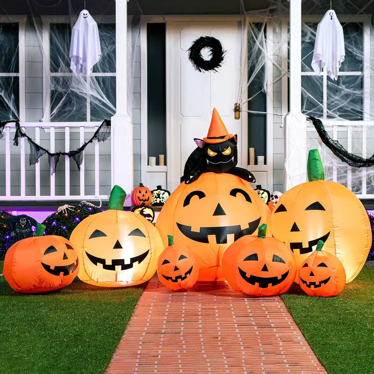 • Excellent Design. This 7ft Long Halloween Spooky Inflatable Pumpkin with Witch's Cat on Top is the ideal Halloween blow up yard decorations for your Halloween Eerie Night. This inflatable comes with an extended cord, ground stakes, fastened ropes, built-in sandbags, and a plug with UL certification. The features help secure the pumpkins in place, preventing it from being blown away by wind outdoors.