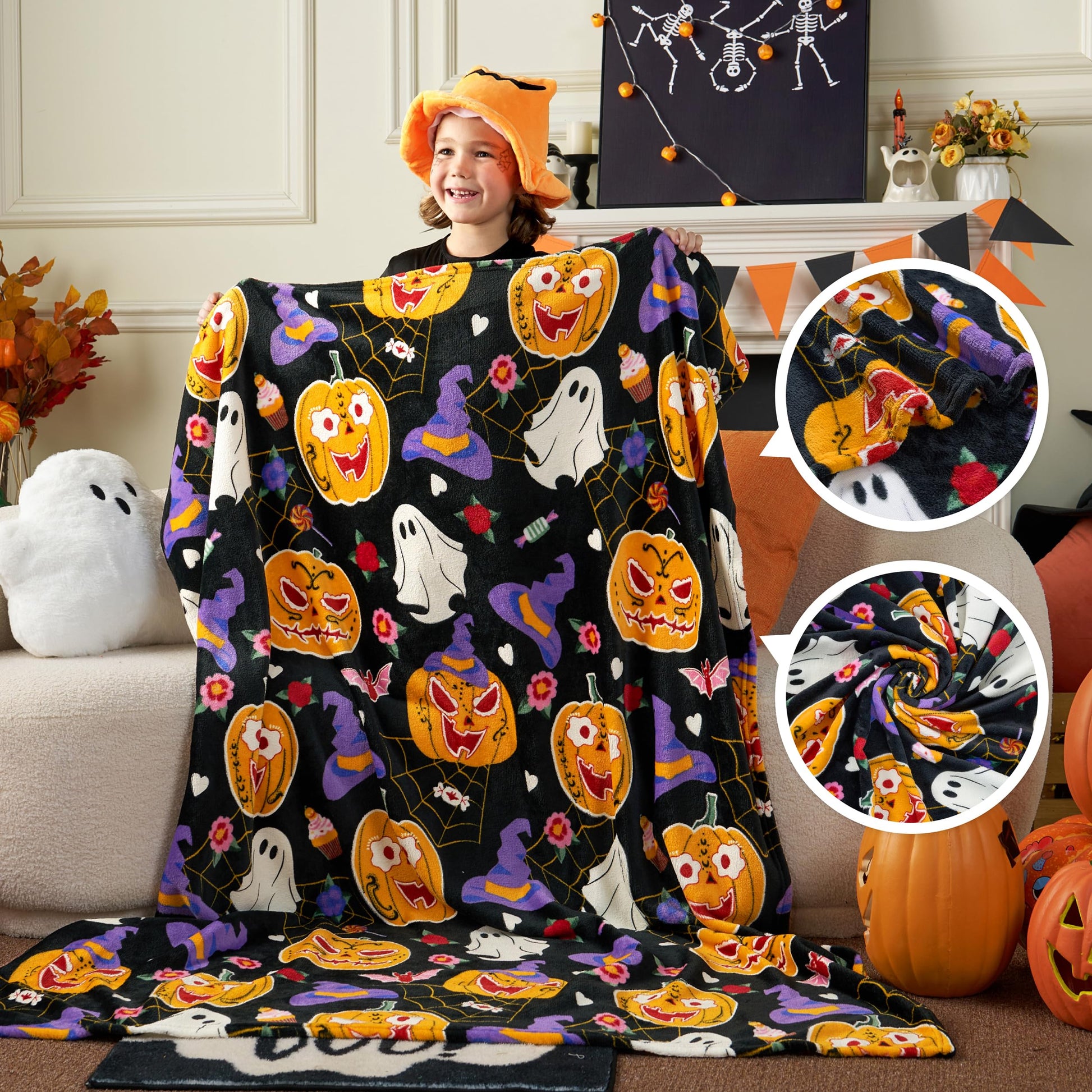Joiedomi Halloween Blanket Soft Flannel Fleece Throw Blanket Glow in The Dark Halloween Pumpkin Ghost Bat for Kids Bed Living Room Gifts 50"×60"